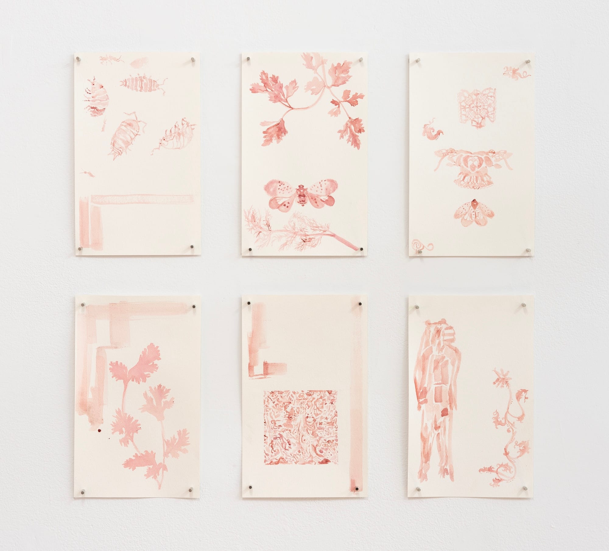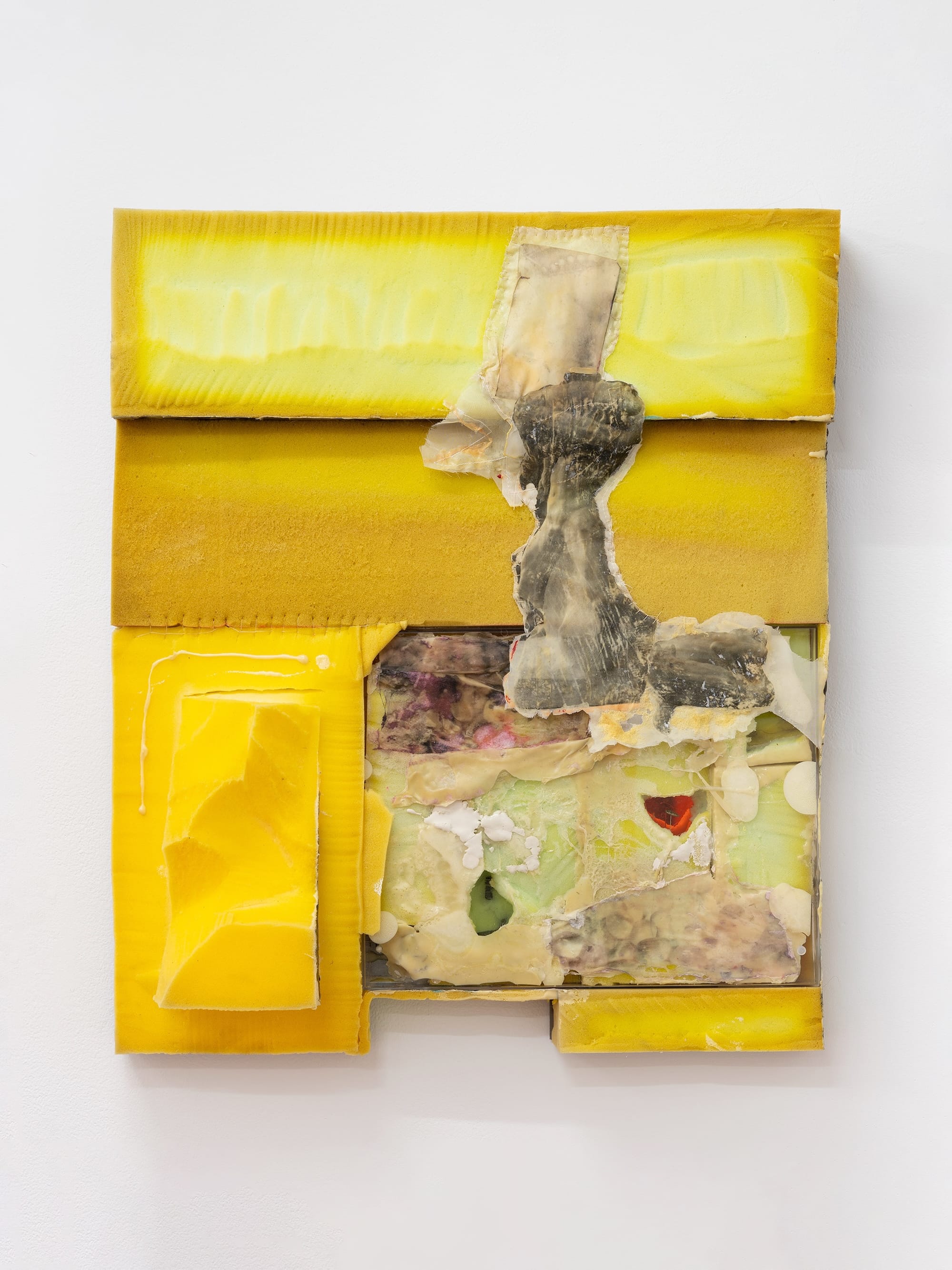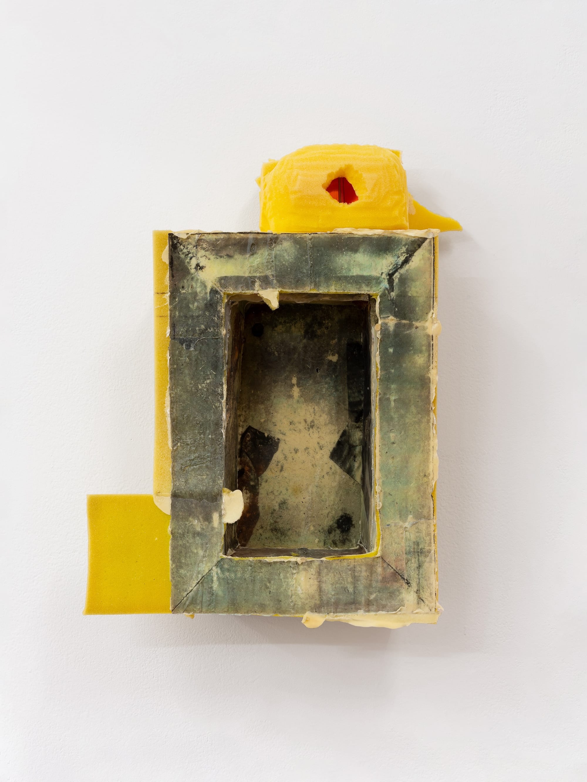 Small details throughout the show hint at the necessity and limitations of care. A vinyl strip door has been installed behind the wooden entryway door, as if the gallery itself were a container requiring an extra protective layer from the outside world. The bricolage sculptures, riddled with nooks and crannies, and bearing the imprints of their fabrication, double as human decor and animal shelter. The isopods Kasparhauser cultivates inside those structures could be mistaken for bugs but are actually crustaceans, whose exoskeletons shield their vulnerable bodies. The artist depicts these literal and metaphorical containers with coarse realism; they may not always provide the comfort our species or others desire, but they’re what’s available, which is better than nothing.
