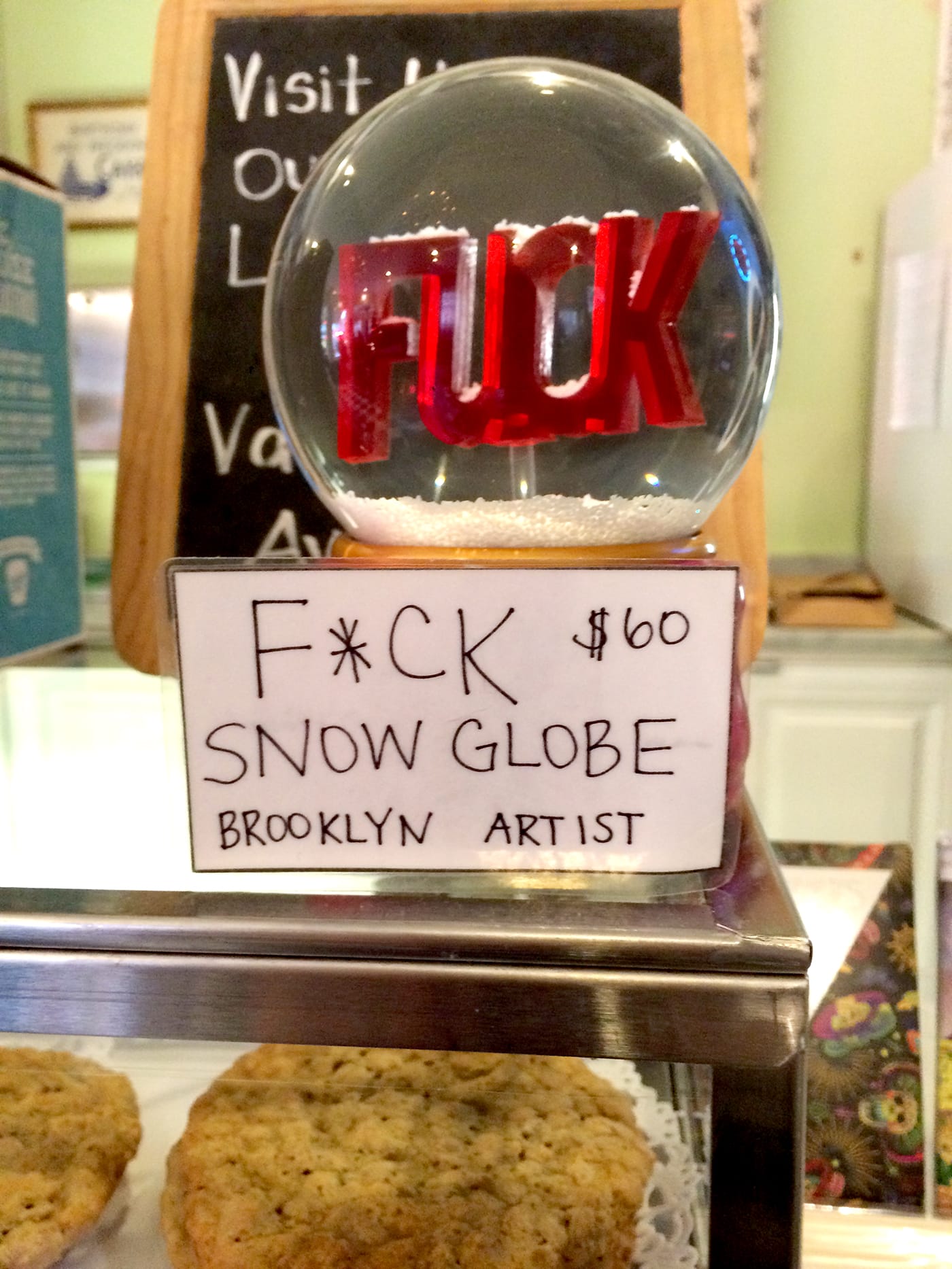 The artists who should have received credit here are Nora Ligorano and Marshall Reese, who together work under the name Ligorano/Reese. Their “F**K Snow Globe,” as the work is officially titled, was created in 2008; you can find it in many art and design stores, including at the New Museum, where it’s a bestseller. The transgression of non-accreditation here, though a glaring oversight, could be excused: I don’t expect a Soho cupcake store to necessarily know of Ligorano/Reese or care about promoting them (although someone knows of them enough to know they’re based in Brooklyn). But the words “BROOKLYN ARTIST” are more than a negligent scrawl; they’re an example of a marketing strategy that feeds on the trendiness of the borough — which is, by now, a global phenomenon. What’s more, although it’s small, this instance specifically capitalizes on the borough’s artist community, which is increasingly romanticized in visions that overlook very real issues related, for instance, to gentrification and affordable housing (how to sell your Brooklyn space on Airbnb: list it as an “artist’s loft” ).