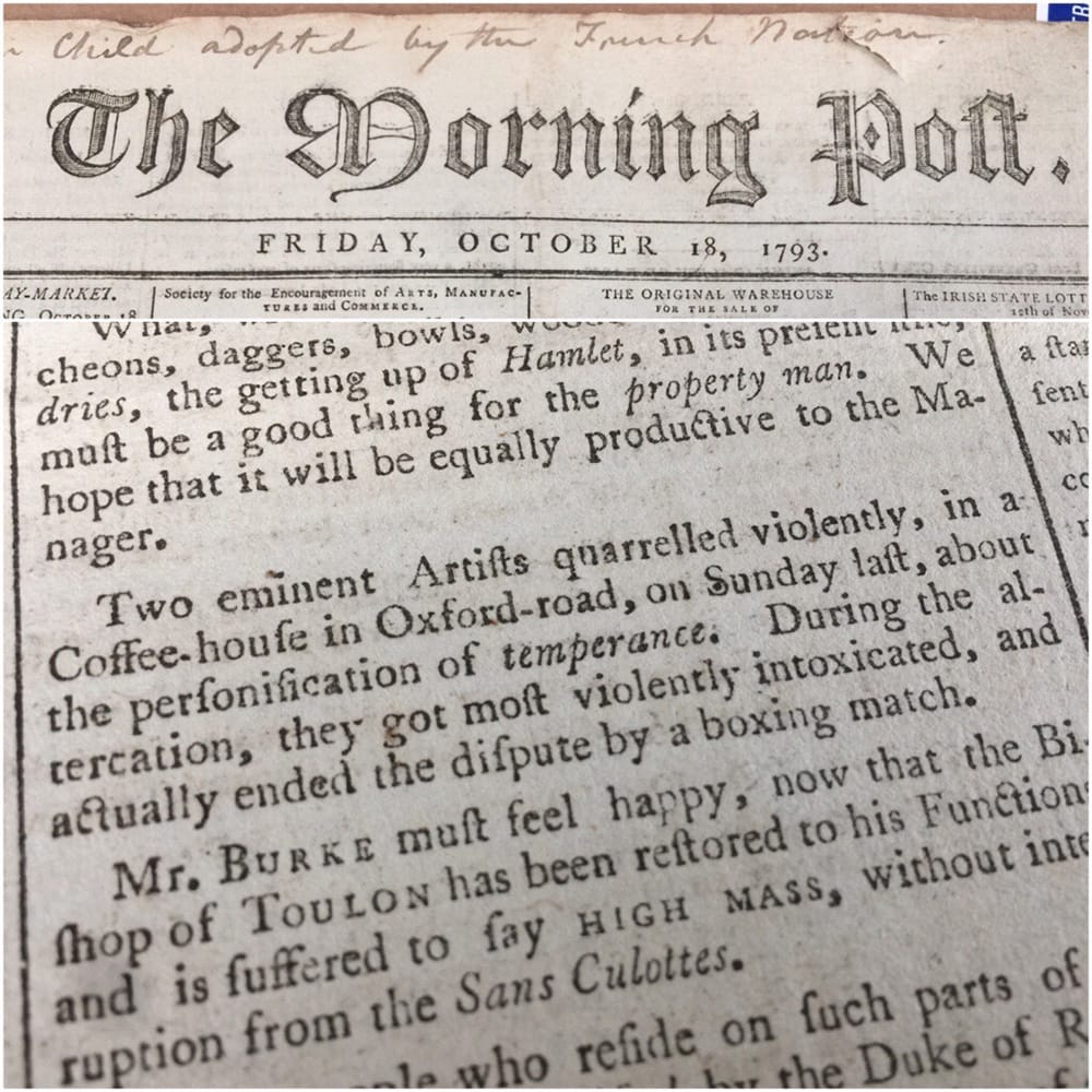 In 1715, artist and writer Jonathan Richardson coined the term “art criticism” in his An Essay on the Theory of Painting. But it wasn’t until the late 18th century that newspapers, like The Morning Chronicle in London, began to write regularly about art exhibitions and happenings. The “modern artist” was beginning to appear regularly in the mass media of the period and became part of daily conversation in various ways. The Morning Post, a conservative London paper, also wrote about art and artists, and in reading their October 18, 1793 edition I recently came across this mention of “two eminent Artists” (notice the capitalization) in a curious brawl over the “personification of temperance.”