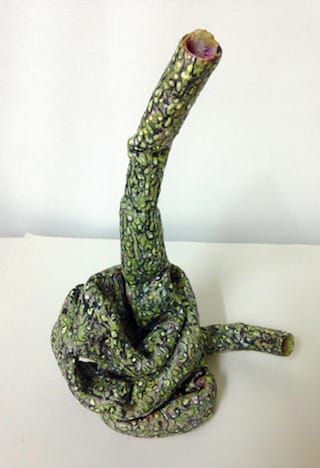 All the pieces in the exhibition are elongated hollow tubes that the artist has twisted, folded, knotted and pinched. While at a residency at The Civitella Ranieri Foundation in Umbria, Italy, in 2013, she made a suite of drawings in which the abstracted, atmospheric grounds were partially reticulated with fine lines; she was also able to complete a group of ceramic pieces. In the ceramics on display, the surfaces go from smooth to pebbly, with partially reticulated areas that look almost as if someone had doodled on the surface here and there. The combination of an uneven, pebbly surface and a reticulated network on the pale green ceramic, “Twisted “8 (2015), is likely to remind the viewer of a molted snake skin. Equally reptilian, the puckered skin in “Twisted 11” and the pocked surface of “Lava Dyad” (both 2015) suggest the effects of extreme heat, both manmade and natural.