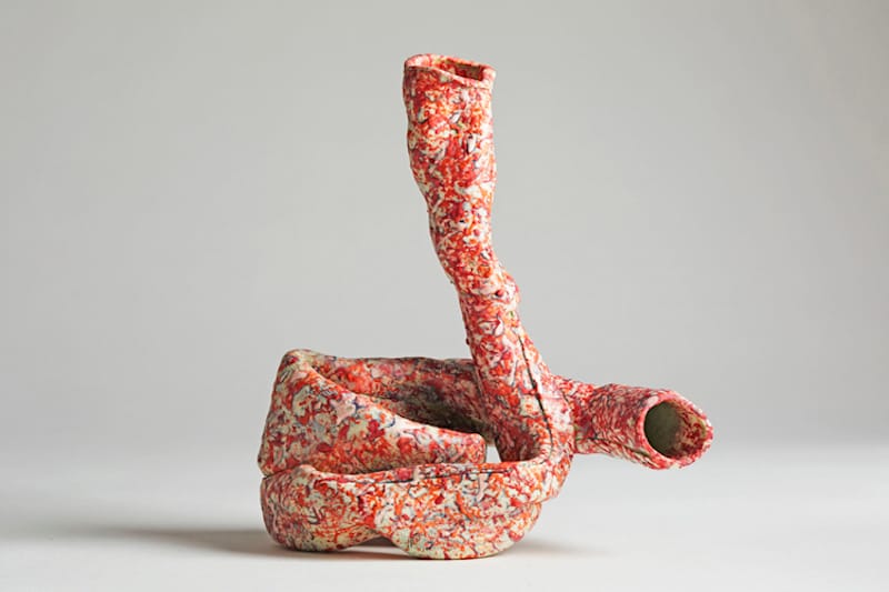 By twisting, folding and pinching the hollow tubes, D’Arrigo knowingly occupies a territory first opened up by George E. Ohr, “The Mad Potter of Biloxi,” who has also been an inspiration for Ken Price and Kathy Butterly. What all of these artists share is a sense of humor, but, in D’Arrigo’s case, this is a relatively new development and a welcome one. Still, it is clear that she can hold her own with these artists, and that is no small thing.