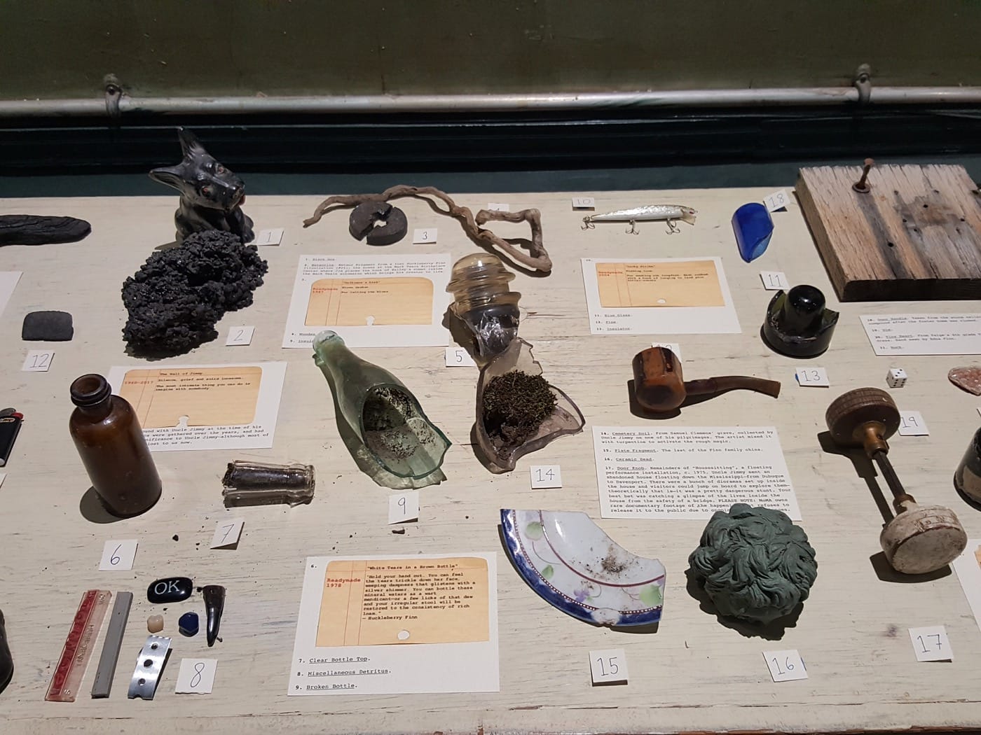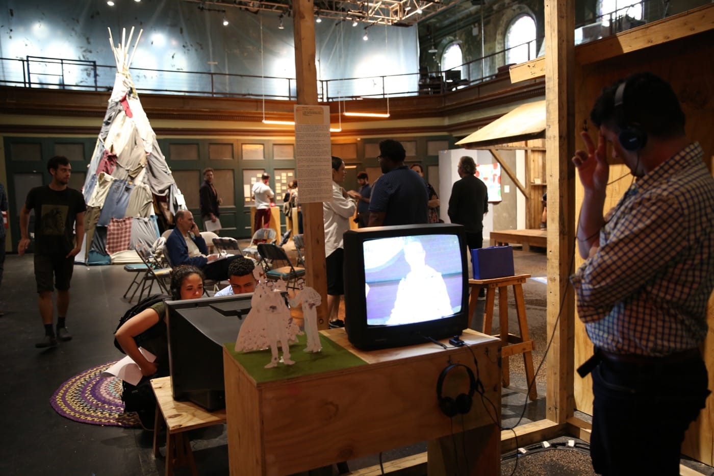 Everything about this setup is clever, particularly the creation of a gallery filled with objects from the “Illuminated Twain.” The audience is allotted about 20 minutes to explore the exhibition before the performance begins. Among the collages and magazines, voice recordings, and abstract sculpture, I linger inside a shed with a stuffed dummy with one white, right hand as rap music plays. Other fascinating pieces include a series of what look like antique photographs, whose caption explains they are “Jim’s extended family, thousands of souls that Twain refused to mention”; a teepee made of men’s shirts; and a table covered with artifacts rescued from Clemens’s studio.