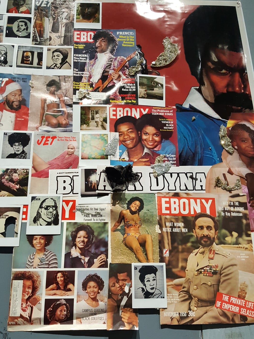 Best of all are the irascible captions written by Uncle Jimmy on ruled, yellowed note cards, like the one for the collage “Magical Negroes,” dated 1980: “found images (Ebony, Jet magazine, Polaroids of antebellum figurines); A gallon of Huck’s tears is not worth a single drop of Jim’s blood.” The piece is what he describes: a collage of magazine covers and mass media images of prominent black celebrities, from Michael Jackson to Haile Selassie, that reveal the artist’s pride in people who are seemingly at the center of culture. There are other brilliant captions, for example, the one for “Illumination #29: Paige Turner,” dated 1996: “Good terrorism destroys a culture’s deepest held beliefs — like how in the 19th century, the anarchists once tried to destroy the clock in Greenwich, England to rattle the British Empire’s assumption that it was the center of time itself.” Uncle Jimmy emerges here as a black artist who’s both profoundly aware and deeply critical of the historical legacy he’s inherited. You can see his character in the gallery: sharp, with sharp edges.