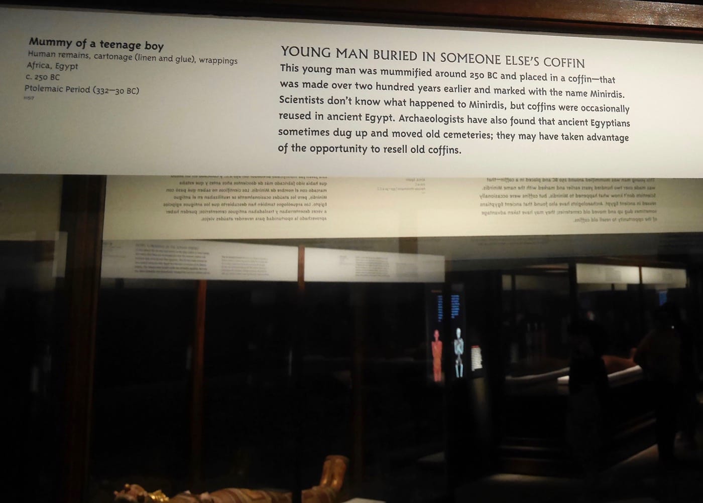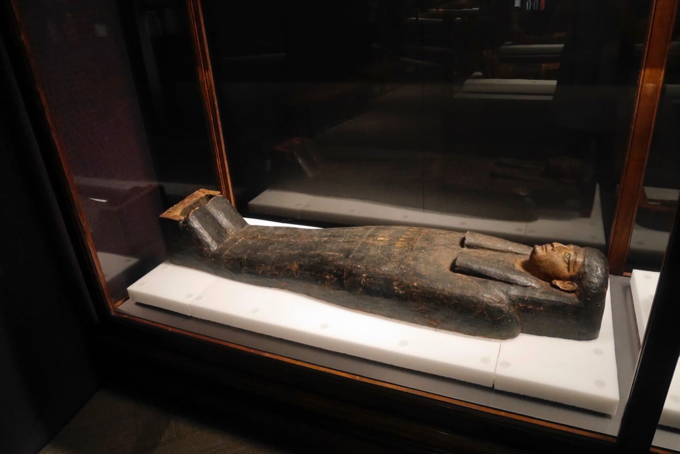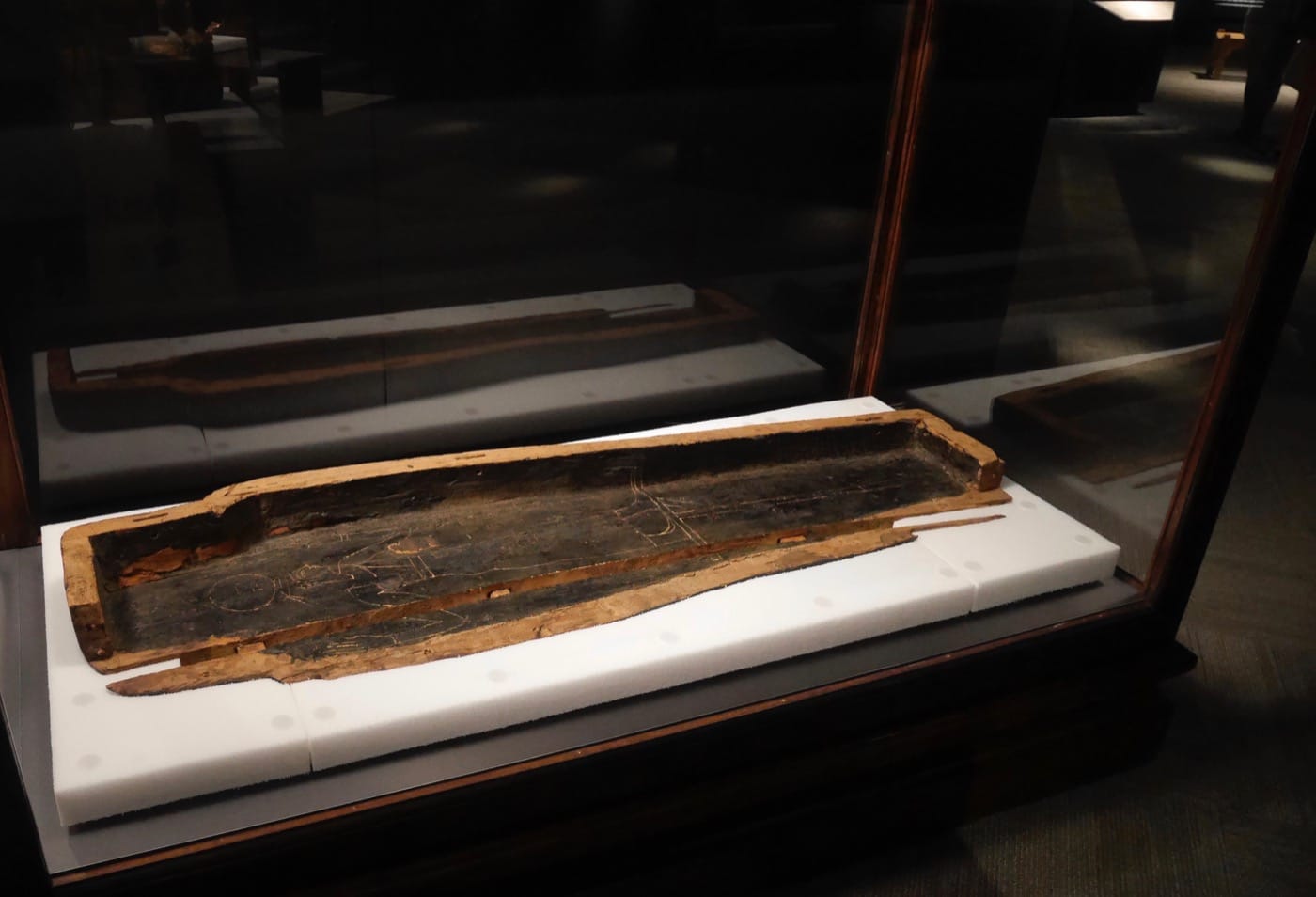 Other aspects of the exhibition may be more typical, though these too are generally executed well. At one point we see a recreation of a 26th Dynasty Egyptian tomb (c. 600 BCE), to provide a context for the placement of mummies; at another, we see an Egyptian coffin with its lid removed, allowing us to observe details of construction as well as drawings on the inside. All the while, mood music meant to inspire awe and wonder plays, though perhaps it’s also a little creepy.