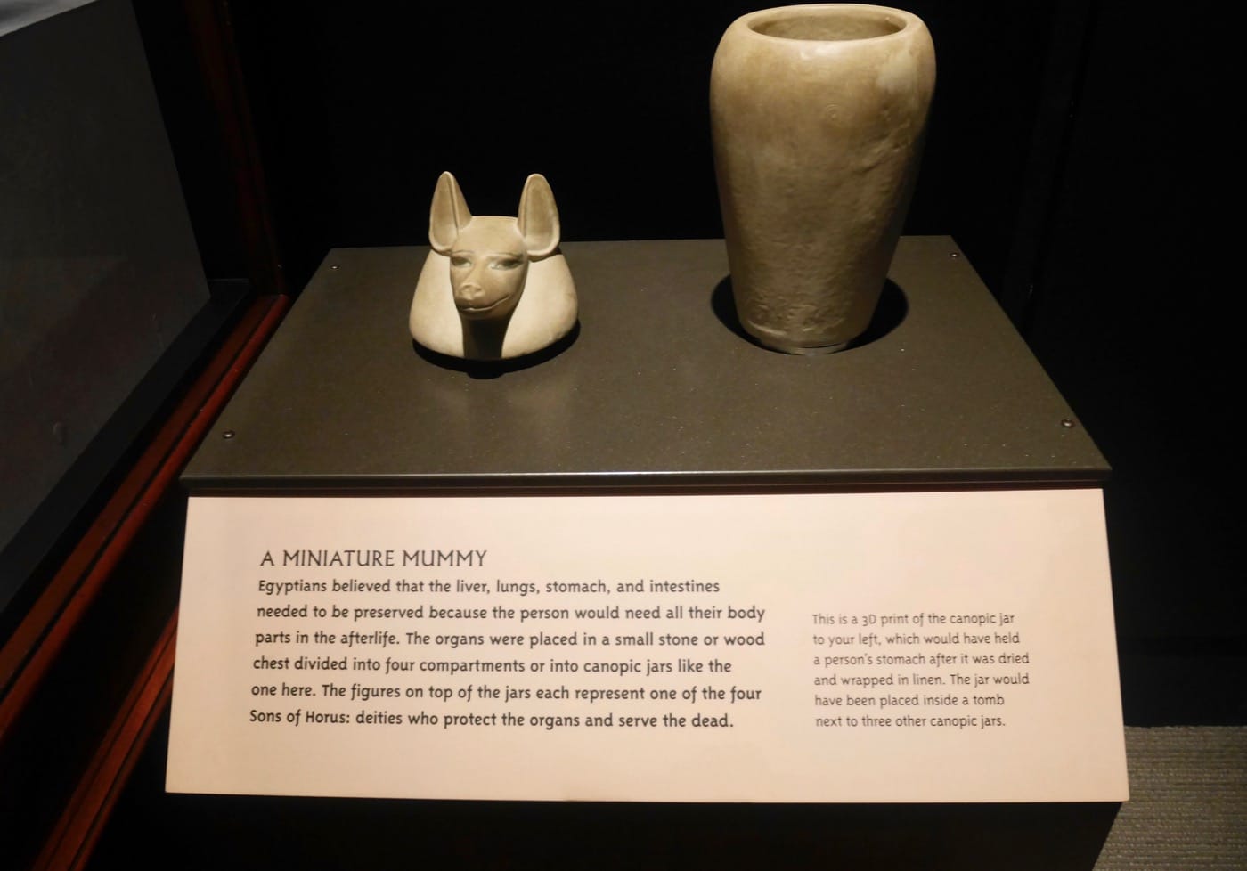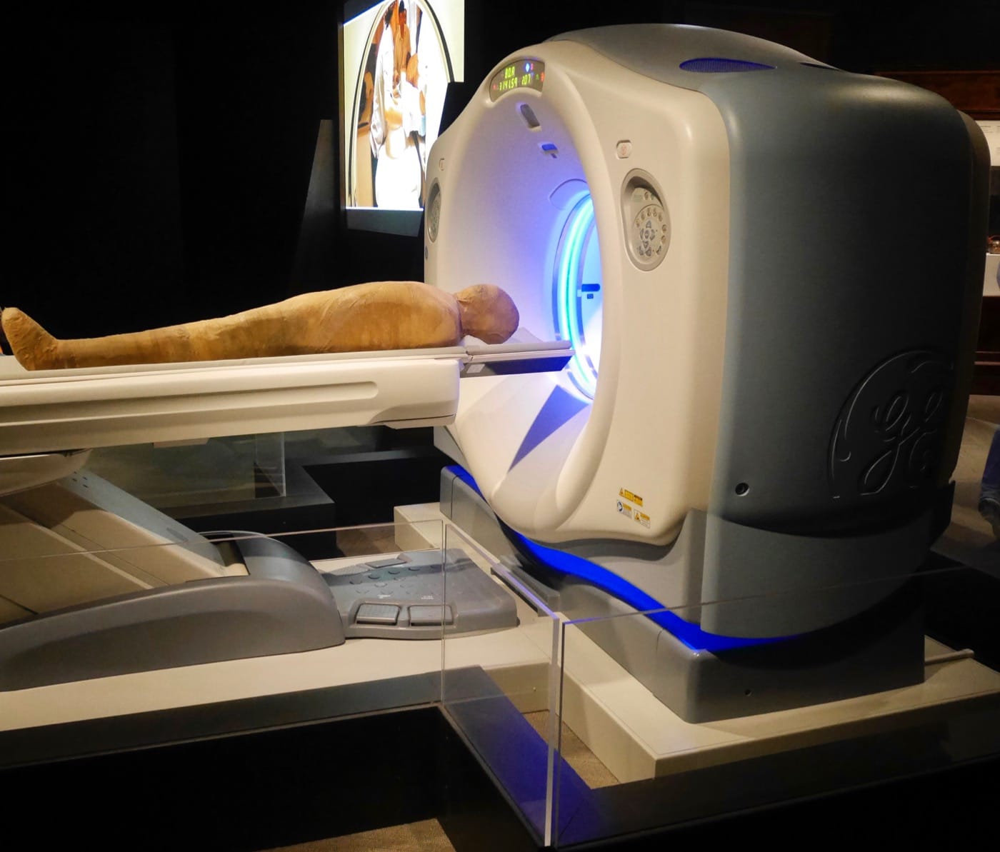 One of the main themes running through the exhibition seems to be the juxtaposition of the distant past with the modern present. The museum’s press release emphasizes “cutting-edge technology,” and we encounter it throughout. CT scans are placed alongside the mummies to reveal what lies beneath the wrappings. Their importance is highlighted by the prominent placement of a scanner (donated by GE) with a model mummy in the opening room of the exhibition. Interactive touch screens allow for 3D manipulation of mummies — one each from Egypt and Peru. The 3D-printed replicas give a vital sense of feel for objects we would otherwise not be allowed to touch.