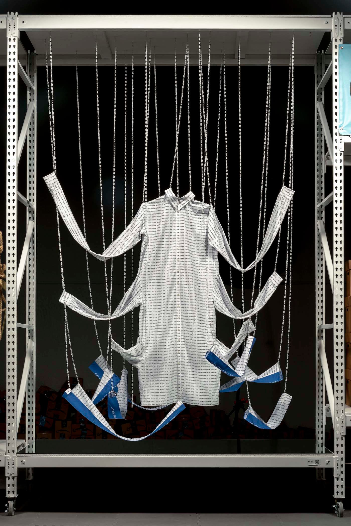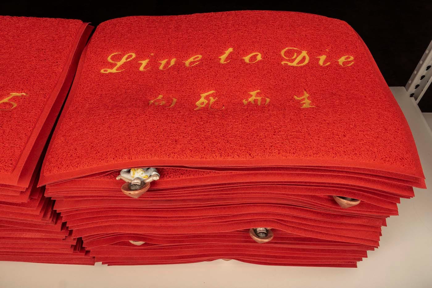 Several participating artists commissioned to make work for The Fulfillment Center confessed to Hyperallergic that the cost of making their artwork (including materials, shipping, and travel), exceeded their payment. Artist Jennifer Ling Datchuk’s “Live to Die” (2019) filled several shelves with stacks of red doormats that say “welcome” in Chinese and English. Pinned between the rugs marked with the color of luck and fortune are figurines of a girl wearing an Asian rice hat and carrying a bundle across her back. Datchuk told Hyperallergic via email: