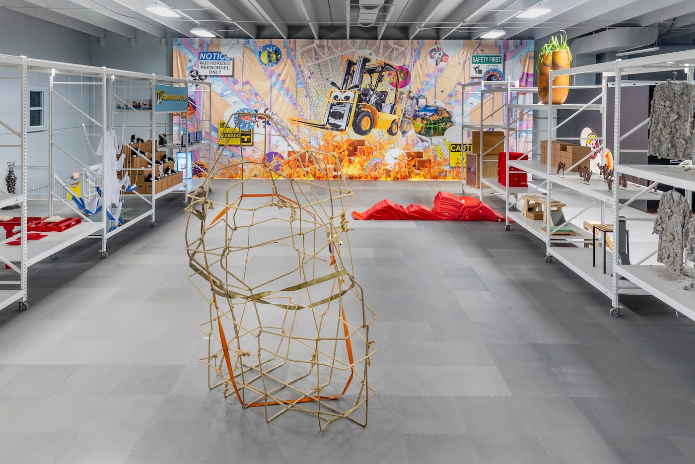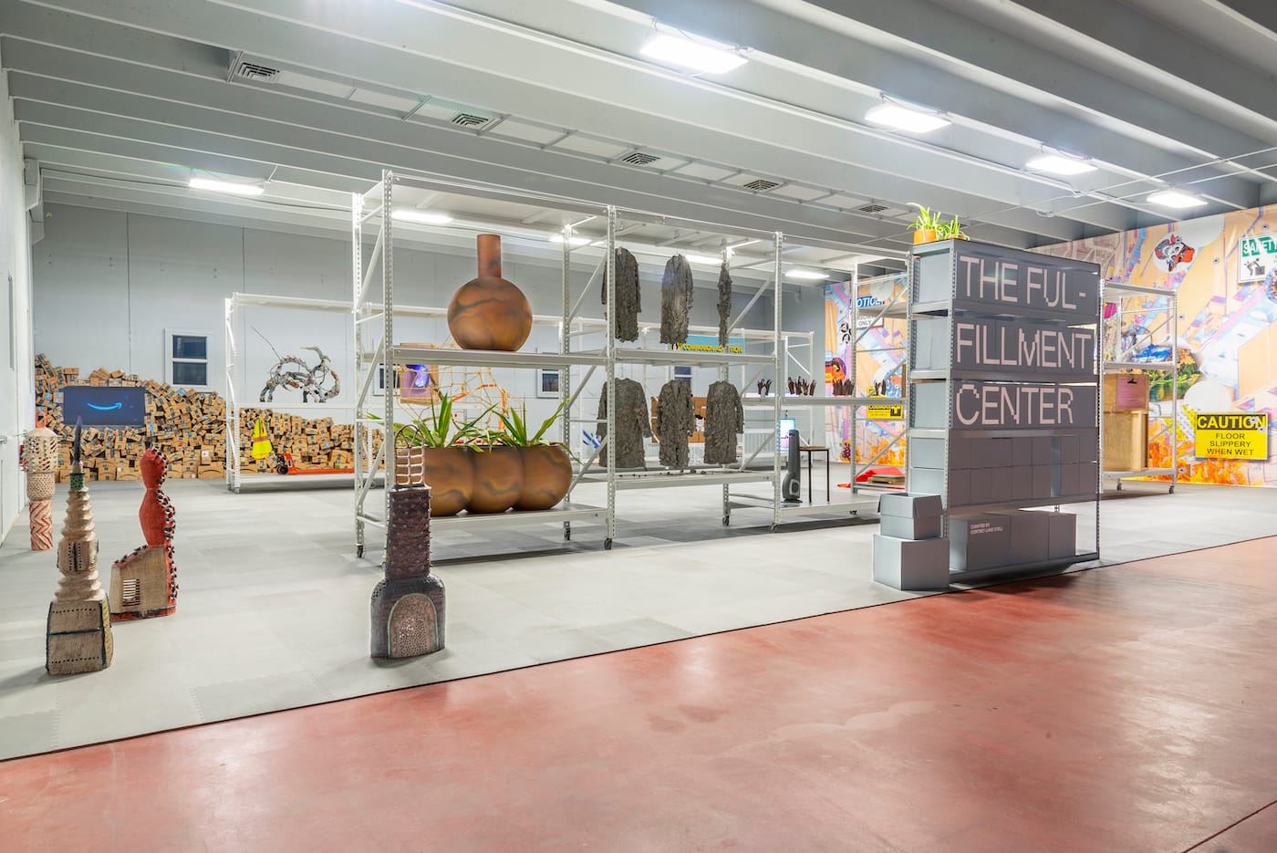 I move freely amongst the abundant shelves in a bustling warehouse, not bound by the clock or an objective. I’m surrounded by smiling cardboard boxes, but I’m not at one of the United States’ over 300 Amazon facilities; I am at the art exhibition The Fulfillment Center created by Black Cube, which calls itself “a nomadic art museum”. Executive director and curator Cortney Lane Stell has argued that the show spotlights the impact of e-commerce on laborers. I saw this unique show months ago, but as time passed it wore on me and I became increasingly concerned about the workers — I mean artists — and more ambivalent about the commodities — I mean art.