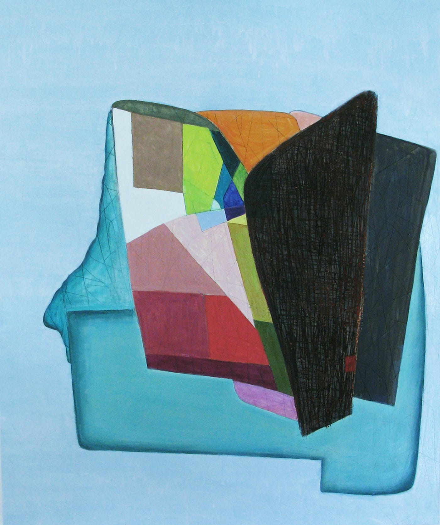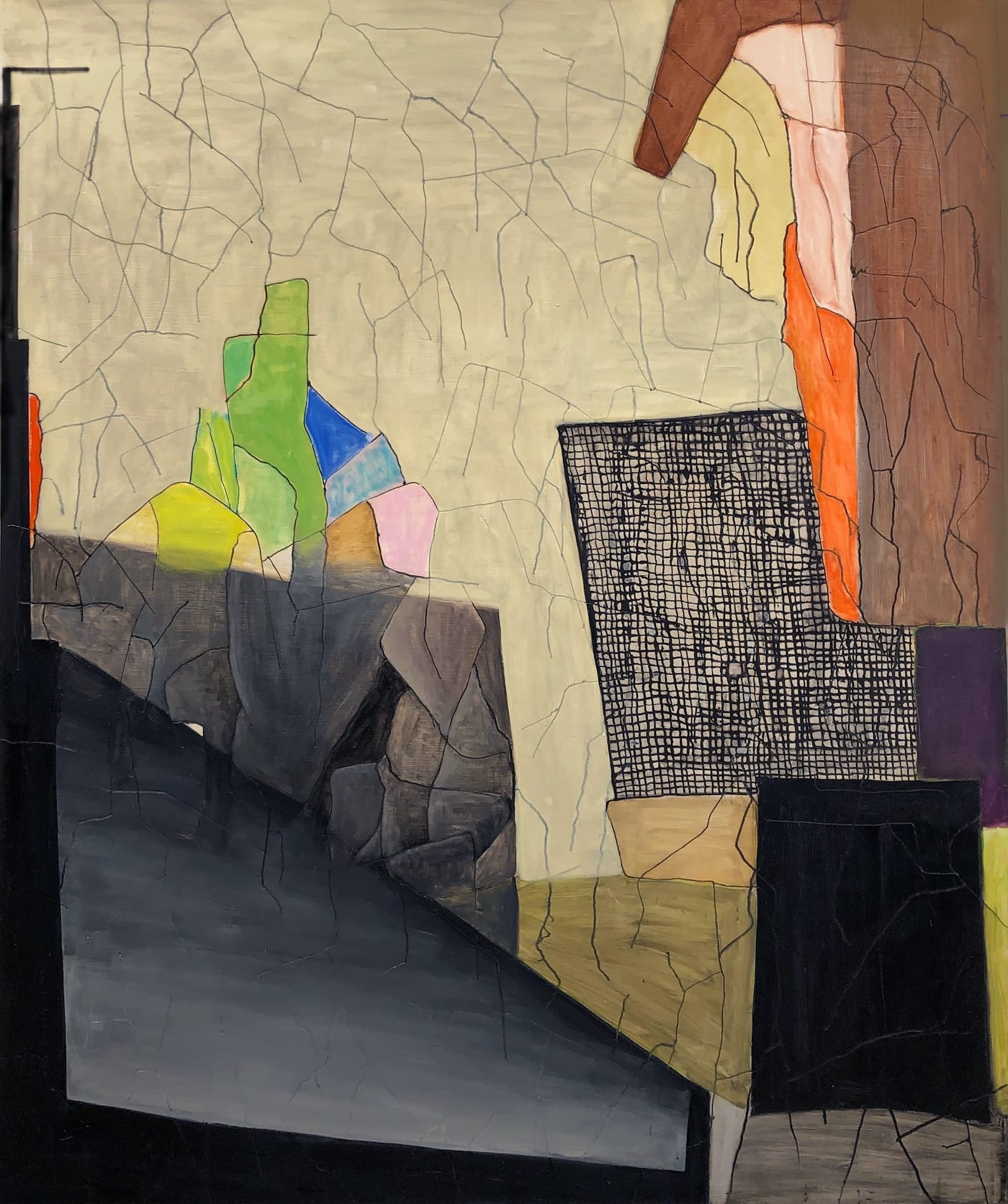 In “Green Ice” (2018), white and pink forms exist on a narrow diagonal ledge made of built-up black paint, with a triangular line above them, like the outline of a tent or pyramid. Deep black gouges mark the painting’s upper area, or green sky. And yet, even as I write the word “sky,” I also recognize there is something mineral-like about the cut green surface. Is it meant to evoke cracked ceramics, with the picture plane literally splitting apart, a scarred skin?