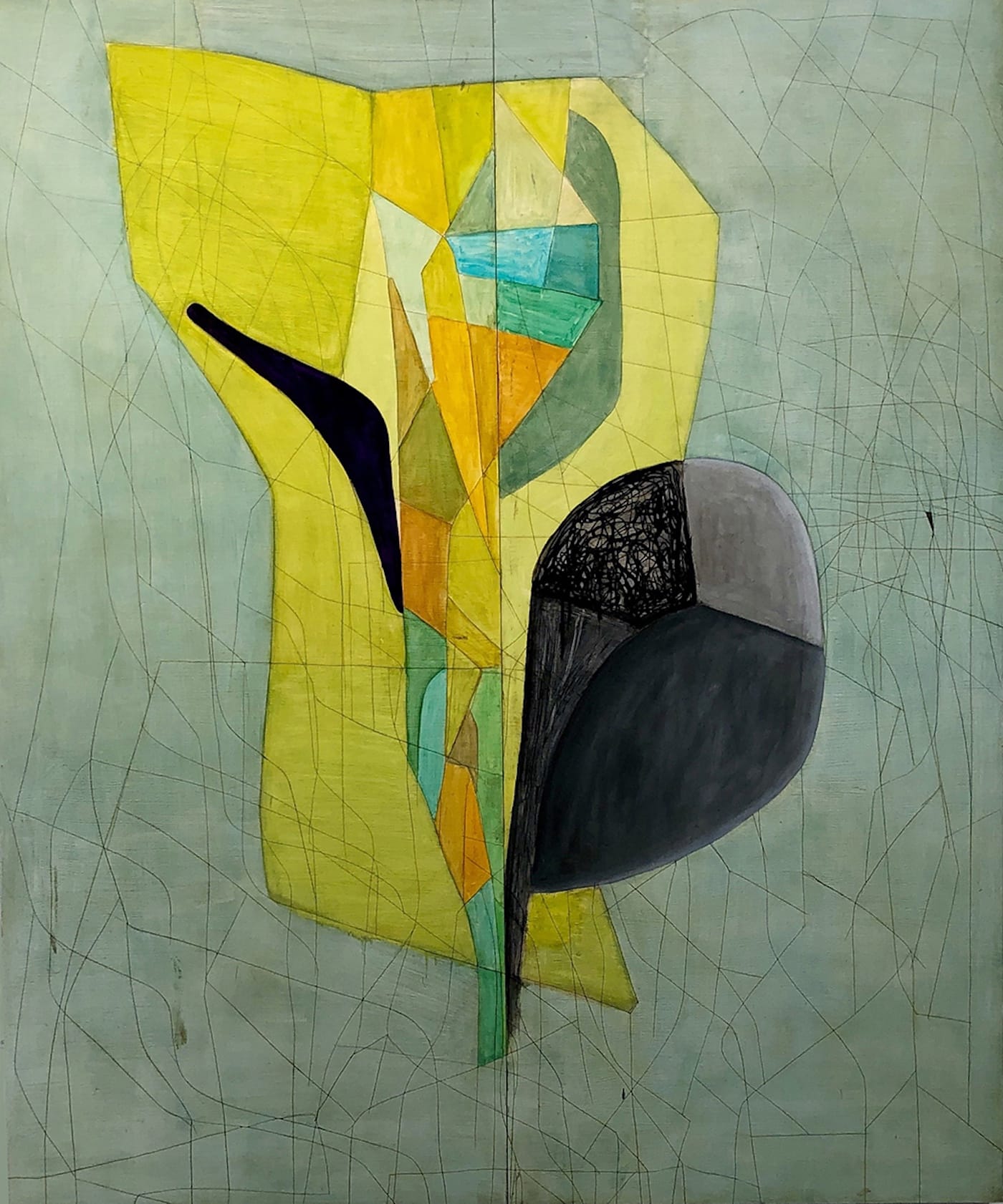 Elliot’s remark gave me an unexpected context for reflecting on the faceted, planar forms in Goodman’s paintings – their combination of the organic and geometric. I am thinking of “Passing Through,” “Something Magical,” “Double Talk,” “Calm,” and “Early Morning” (all dated 2019). In contrast to Scheerbart’s idealization of the crystal, Goodman’s wood supports are marred with deep gouges. The scarred surface of “Early Morning” conveys wounds and psychic pain, the source of which Goodman never specifies. This imbues the painting with feelings we are unable to articulate; a sense of muteness prevails.