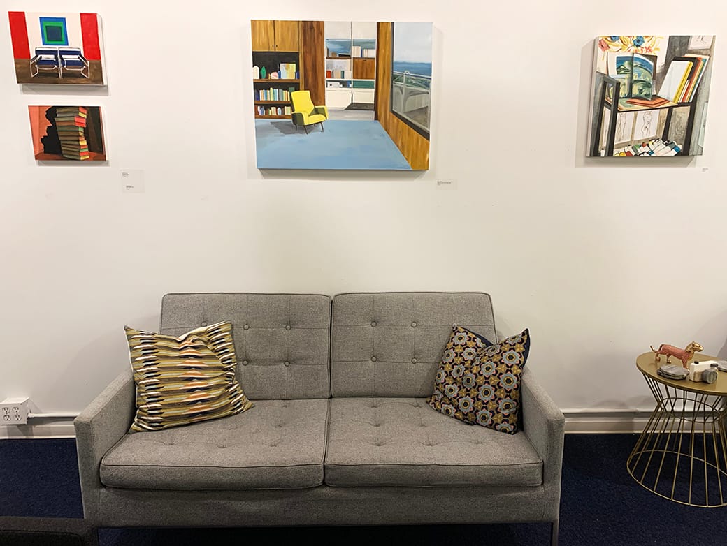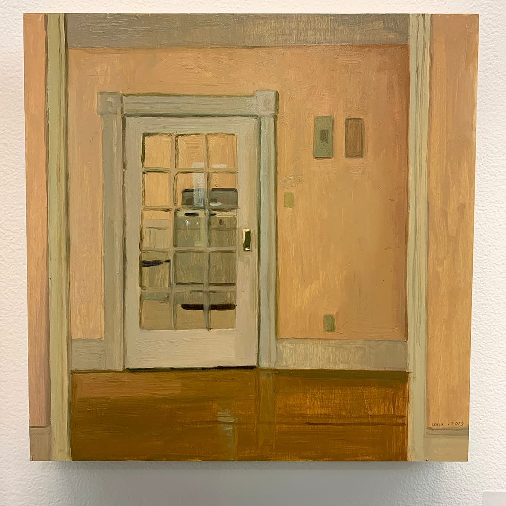 Inside the co-working space The Yard, artist Kirstin Lamb curates group exhibitions every three months in a collaboration that suits artists looking to sell and startups needing a creative office aesthetic. Adhering to The Yard’s “no portraits” rule, Lamb’s current exhibition titled “Indoor Voices” features six painters exploring the domestic. Dodging the thematic trend of retro furniture and home gardens were the almost monochromatic, intimate-sized paintings of Vena Gu. Gazing out soberly from curtained windows or doorways, her quietly provocative paintings offered a welcome escape from overly designed decor.
