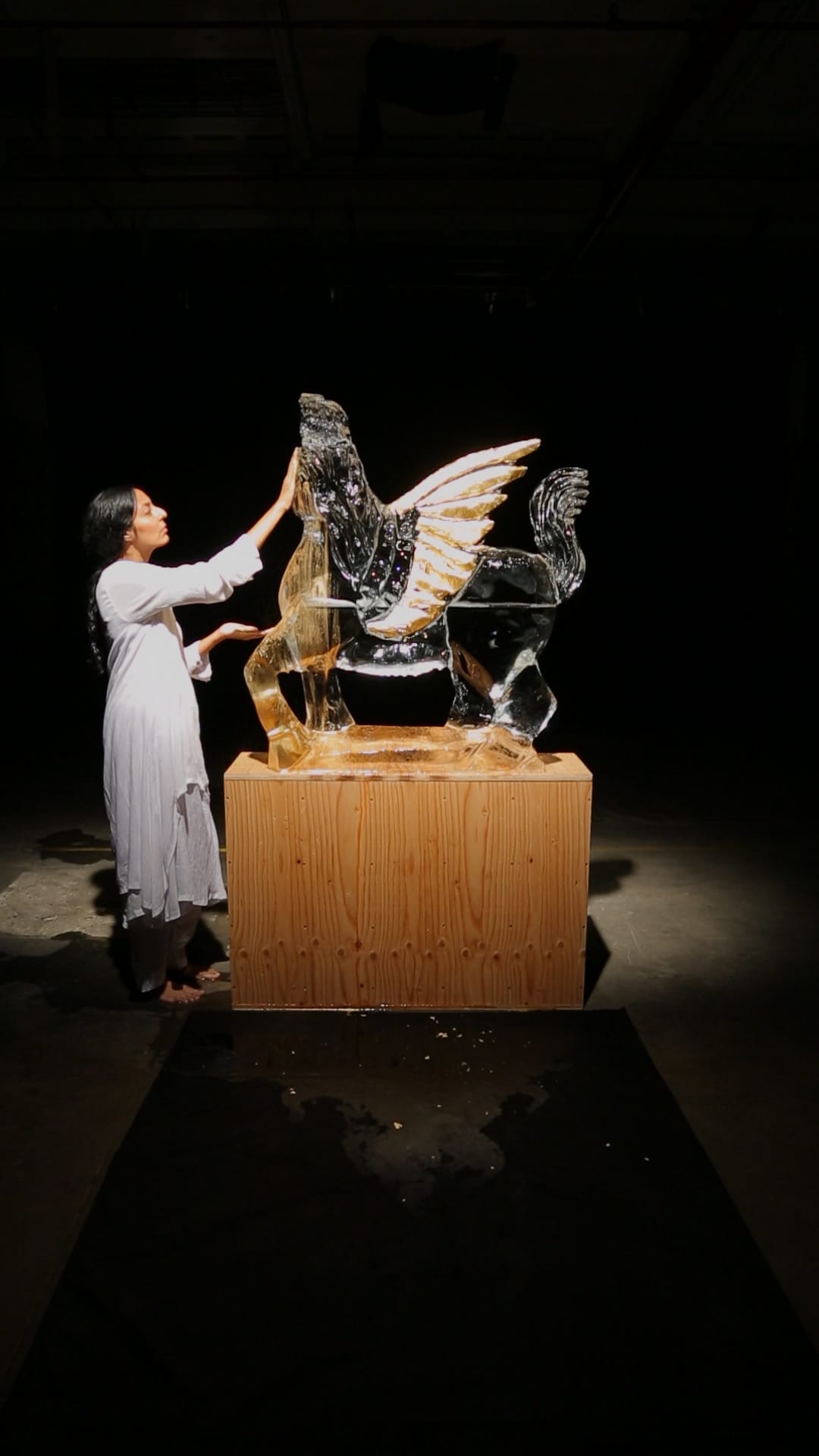 The sound of dripping water accompanies Arshia Fatima Haq’s “The Ascension” (2018). A collaborative project produced with LA-based artist Cassils, Haq is seen gilding an ice sculpture of the Buraq, the mythical creature — part woman, part horse — described in the Qur’an as transporting the Prophet Muhammed between terrestrial and heavenly planes. Haq’s use of gold leaf and dust evokes the long history of Islamic artistic accomplishment across multiple media, but illuminated manuscripts particularly, and the skill required to work the valuable material resource. Here, Haq adorns an object that melts before our eyes. “The Ascension” gently reminds us that no matter how divergent our religious or spiritual beliefs, our mortal endeavors carry a temporal limitation. Whatever those endeavors are, the hard work we do is worthwhile, even if it dissolves like rivulets of gold-streaked water that pools at our feet.
