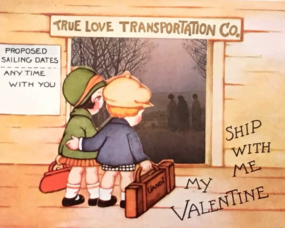 Ashbery begins the story, usually on a note of sweetness and virtue, but lets the viewers finish it. In “Departure Mode” (2016), two young children with their backs to us are about to step through a doorway. Above the doorway is the sign, “True Love Transportation Co.” On the other side of the doorway is a gloomy landscape with three older women (the three graces or Macbeth’s witches?) at the crest of a road, about to descend to whatever awaits them below.