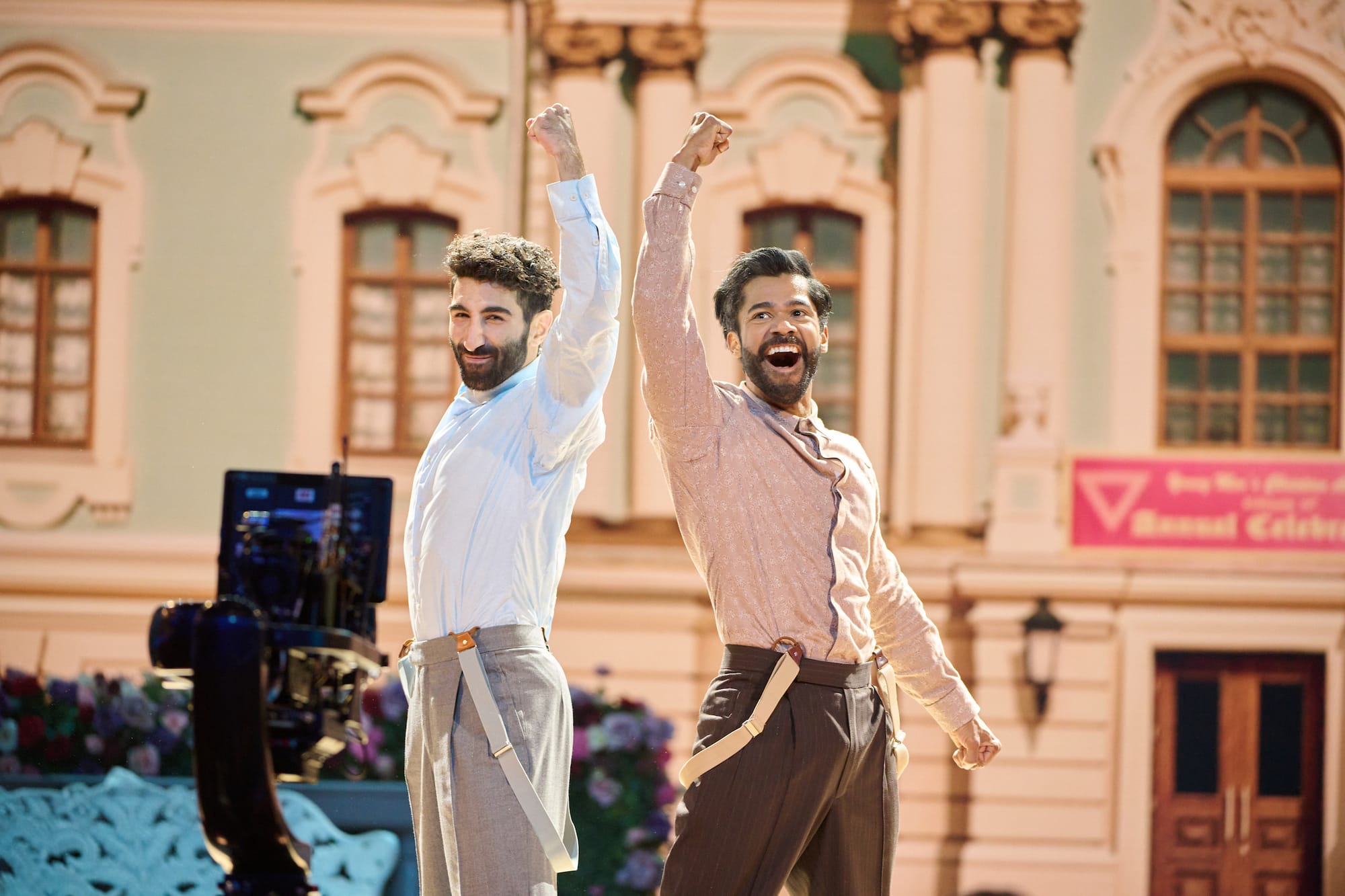 The "choreographers" for the Oscars performance were Napoleon and Tabitha Dumo, known together as Nappytabs, from So You Think You Can Dance. While neither Nappytabs nor the Academy of Motion Picture Arts and Sciences (AMPAS) have responded to Hyperallergic's request for the full list of last night's performers, several social media users reported that none of them were of South Asian descent. The dancers who portrayed the lead characters alongside the film's playback singers Kaala Bhairava and Rahul Sipligunj are confirmed to be Billy Mustapha, a Lebanese-Canadian dancer, and Jason Glover, an American dancer. Both Mustapha and Glover appear to have entered the spotlight through So You Think You Can Dance.