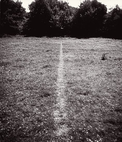 Richard Long began an illustrious career with a piece that took walking as performance, with only a photo document as the end result (seen above). From there, the artist has explored humanity’s relationship with the natural world through the creation of impermanent monuments memorializing his treks, paintings made straight from the elements, and drawings on detritus gathered from man-made urban environments. Long commemorates trips by text written on gallery walls, photographs and posters. This is all just the aftermath of the artistic act, though. The act itself is the movement through space, and the interaction, and intervention, with nature.