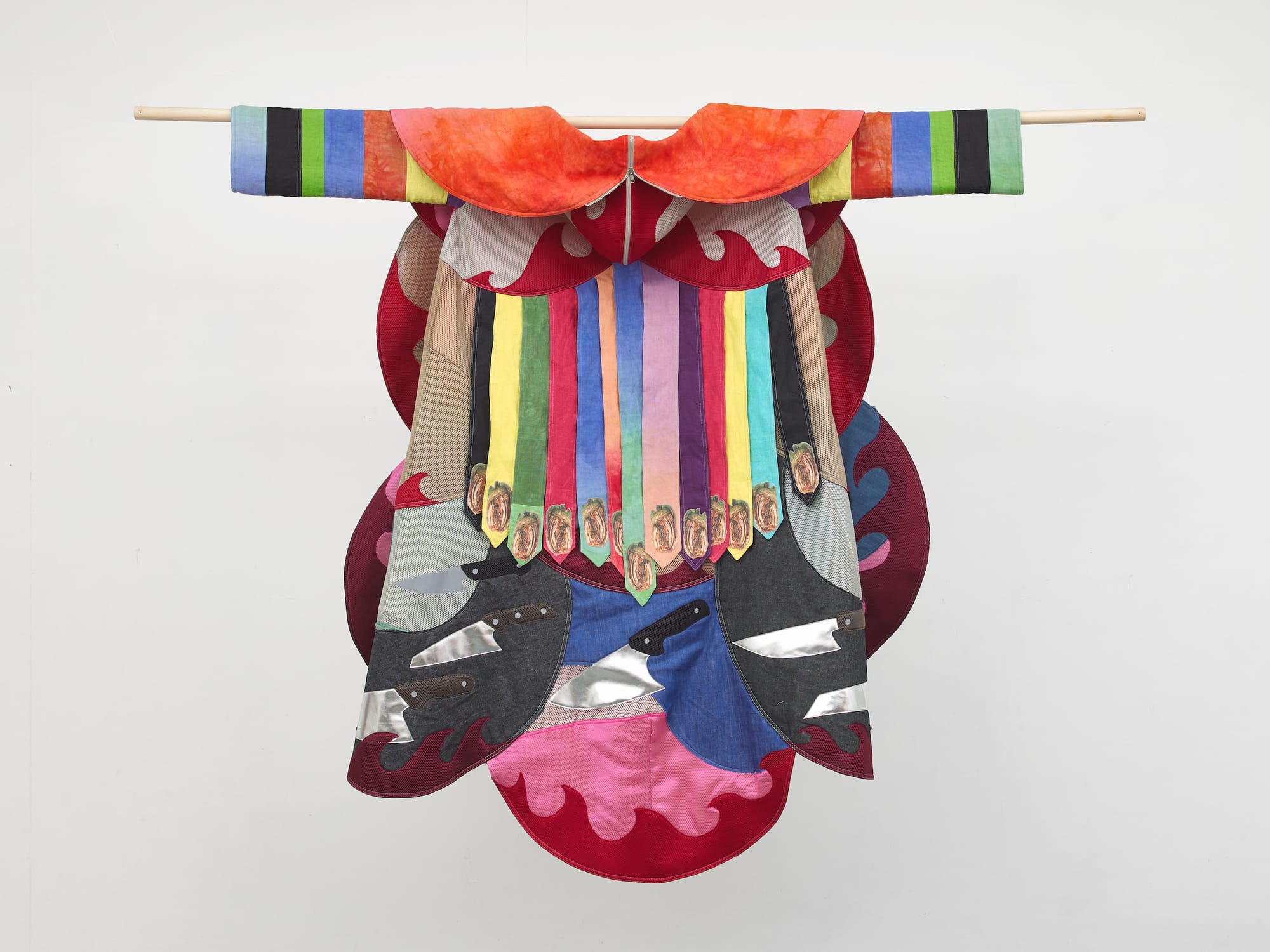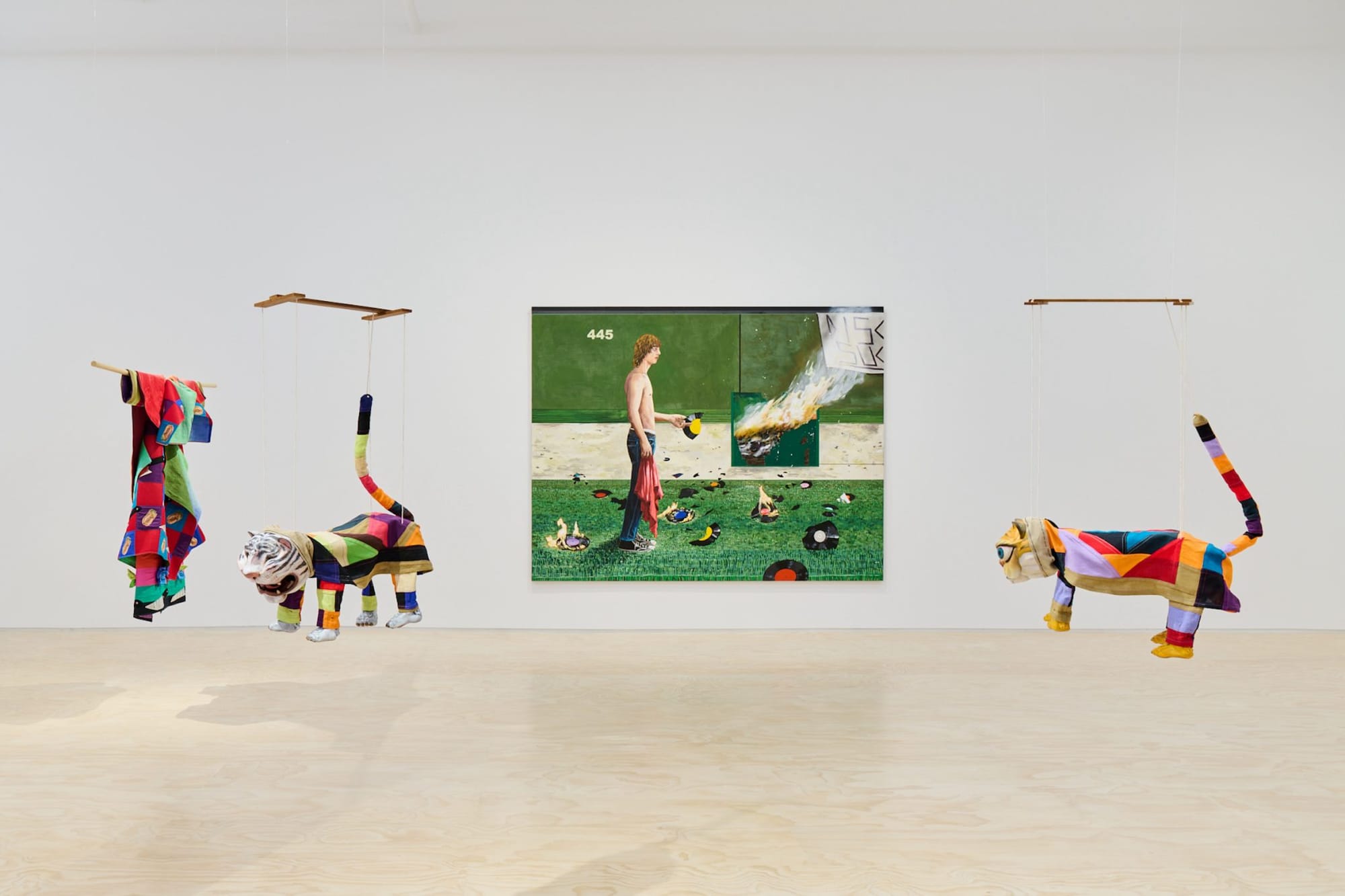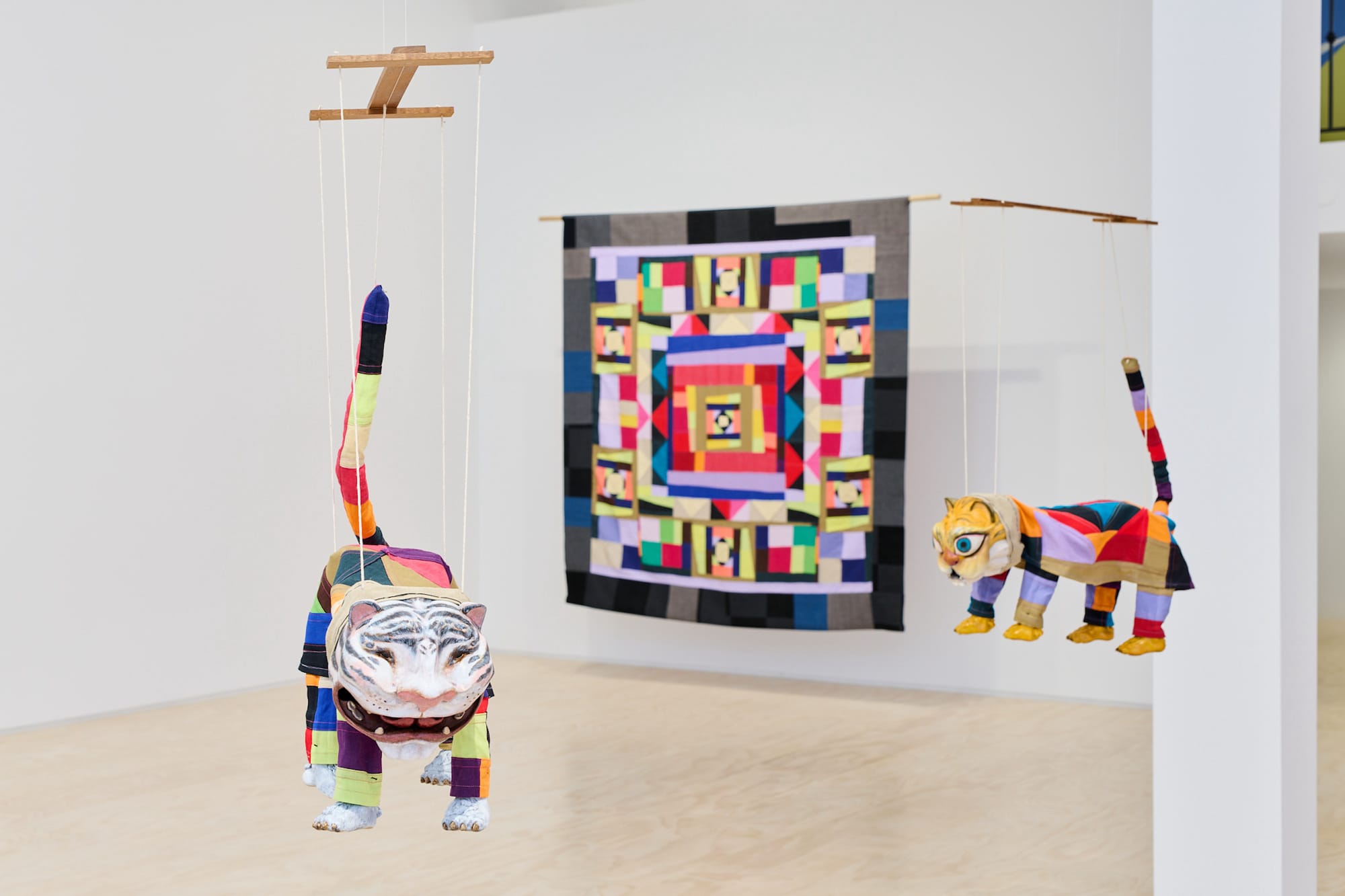Xa’s works hang away from the walls and respond to this discomfort of impending obsolescence with the strength of ritual and matrilineal knowledge that has survived for millennia despite oppression, colonialism, and dislocation. Shiny knives and cabbages adorn the quilted robe “Kimchi Rites, Kitchen Rituals” celebrating the Korean side dish, while a pair of friendly tiger puppets, from her series House gods, animal guides (2022), populate the center of the room. The quilted textiles’ clarity of color and line rhyme with the impasto planes of Bas’s surfaces. Caught in the visual interference from Xa’s work, Bas’s figures halted gestures and forlorn stares struggle to reach each other, deepening one’s sense of the newfound impotence of their White masculinity.