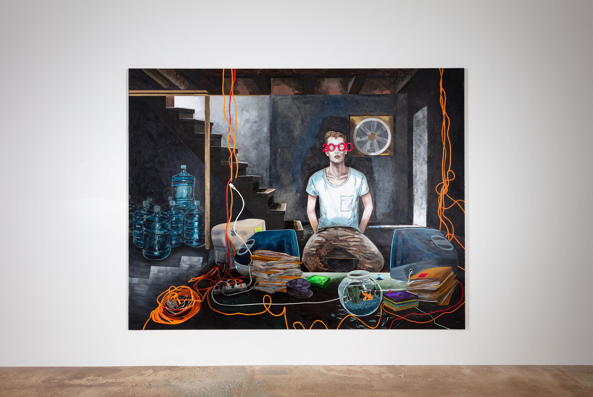 In the main gallery, Bas’s paintings line the walls of the central exhibition space. His large-scale history paintings take on events of the 19th and 20th centuries, queerness, and the occult through the bodies of White, often adolescent, men who populate his richly detailed and unsettled tableaus. In “Disco Demolition Night; December 31st, 1999 (11:58 pm)” and “Ambush Television” (all 2022), Bas’s figures grapple with the emotional turmoil engendered by the outmoded media (vinyl records, CD players, and daytime television) that surround them and seem to be the cause of their crises.