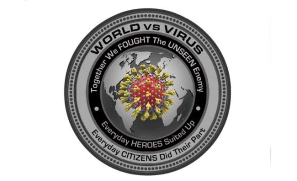 Designed by the company Challenge Design, one side of the coin features a microscopic rendering of SARS-CoV-2 overlaid on a world map, which is surrounded by slogans (with some words capitalized in a typical Trumpian fashion) that read: “World vs Virus; Together We FOUGHT the UNSEEN Enemy; Everyday HEROES Suited Up; Everyday CITIZENS Did Their Part.”