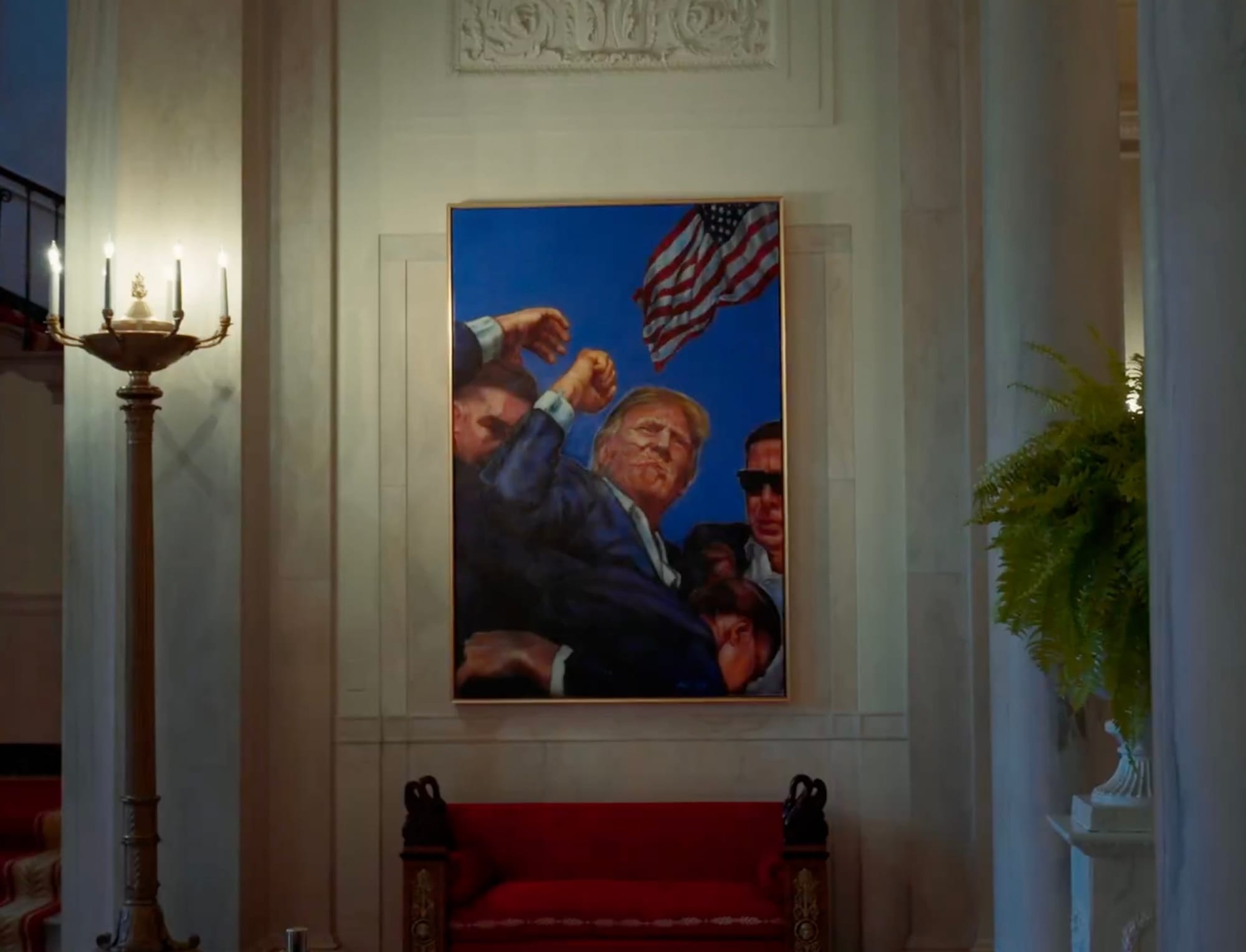 A three-second video of people walking in front of the work was shared by the White House X account in a cryptic post this afternoon, April 11. Clearly visible in the video is the notorious action shot of Trump, who has blood on his face from a bullet scrape to the ear and raises his right arm in a fist as the Secret Service tackles him, all under a United States flag.