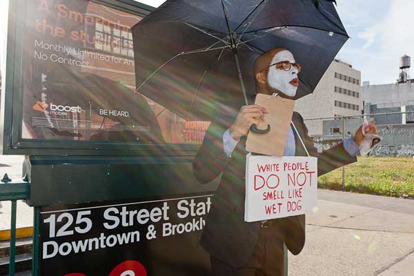 Walking through the traditionally African-American neighborhood of Harlem in white face and a sign around his neck that reads, “White People Do Not Smell Like Wet Dog,” Hill is tapping into something that as a biracial American he is very cognizant of, black attitudes towards whites. An earlier project @WhiteSmellBot continues to sniff around Twitter looking for signs of black racism towards whites and it has found some provocative tweets that suggest, yes, many black Americans seem to think that white people smell like wet dog. I asked the artist if this was all about pushing buttons.