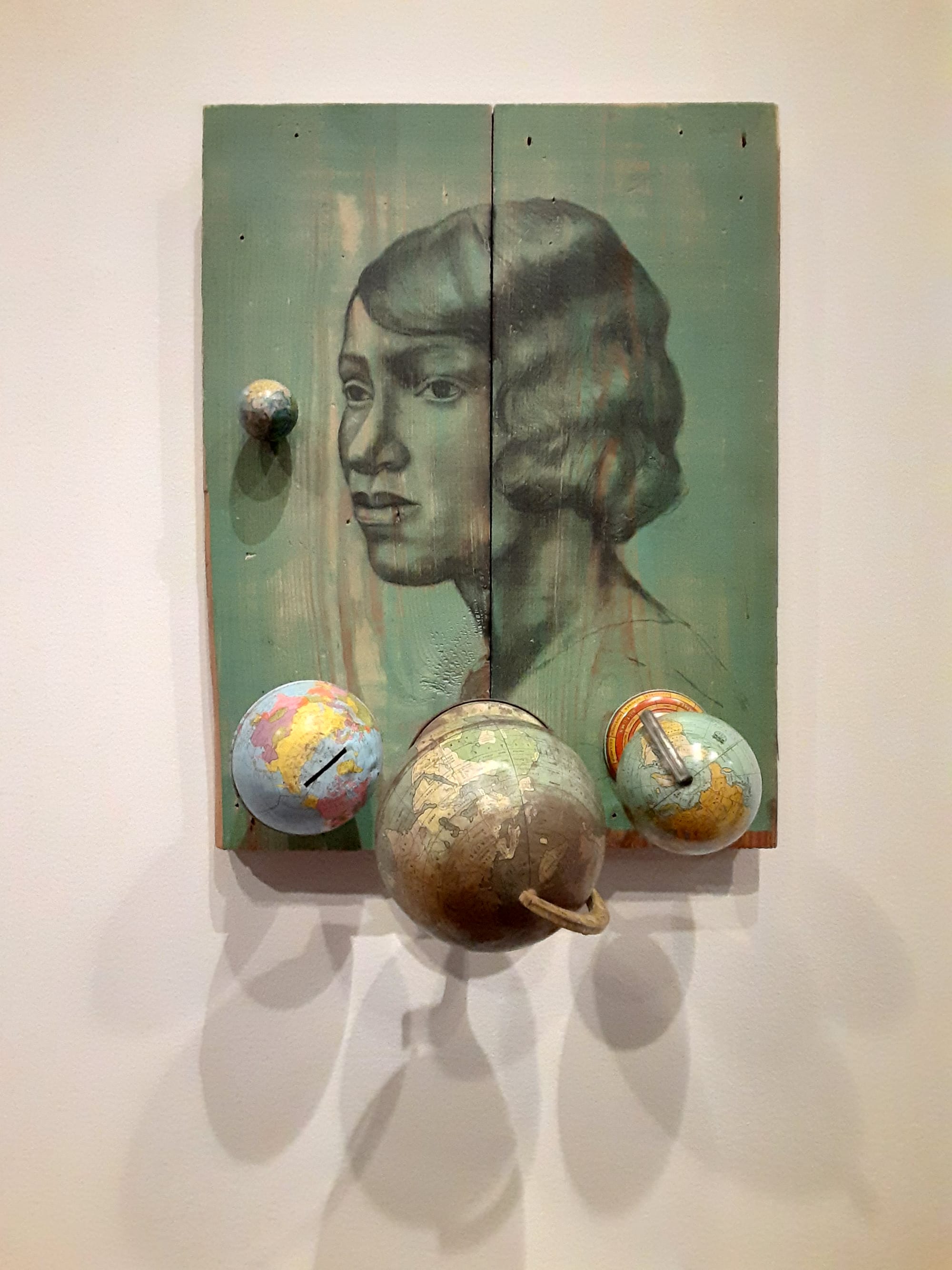 Across his photo-based works, Lovell quarries lost origins through varying types of Black archival imagery. In the Kin (2008–11) series, for instance, he recreates images from photo booths and IDs from between 1850 and 1950 in charcoal. In Card Pieces (2020–21), Lovell has matched each playing card with the frontal portrait of a person with humor and care: The Queen of Hearts, for instance, is a regal woman who looks off into the distance. Among his tableaux, Lovell depicts a man in three-quarters view in “Wreath” (2000), surrounded by a barbed nest out of concentric rusted steel, as protection against hurt. Nearby, in “For…” (2008), a woman gazes outward as globes orbit about her, laved in the same green as "Grandma’s Dress," similarly conveying and closing distances.