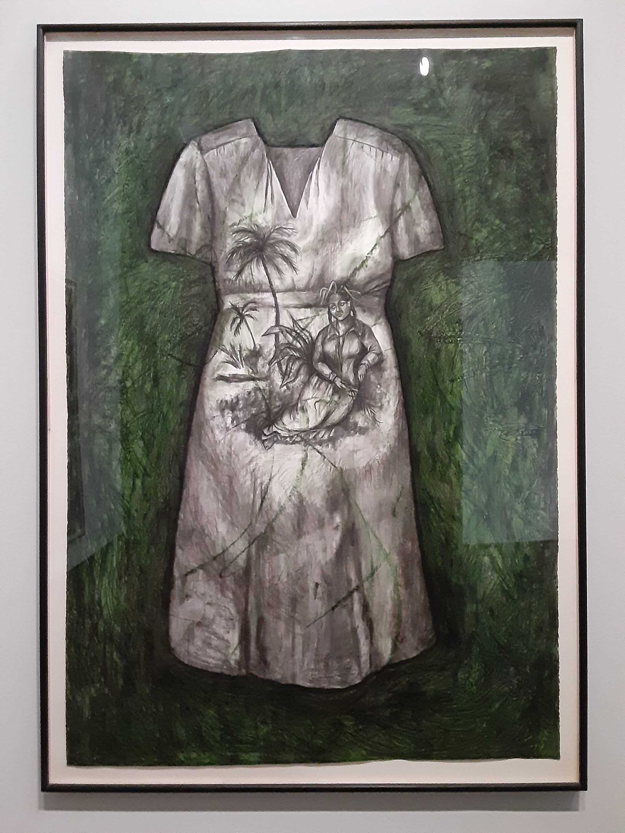 SAN ANTONIO — A tender yearning permeates the traveling career survey of Bronx-born Whitfield Lovell, who forges Black histories from aged photographs. The exhibition begins with Lovell’s works about family and biography beginning in the mid-1980s. At the belly of “Grandma’s Dress” (1990), a Black Indigenous woman half reclines while surrounded by palm trees — part Virgin Mary, part Venus of Urbino — holding a palm frond, a symbol of victory overcoming death. Around the dress, wet green shoots into frenetic arcs, like moving palms. Lovell’s paternal side comes from Barbados; this work celebrates the far origins of the Black Atlantic, and sets the tone of the exhibition’s concern with the search for community and ancestries.