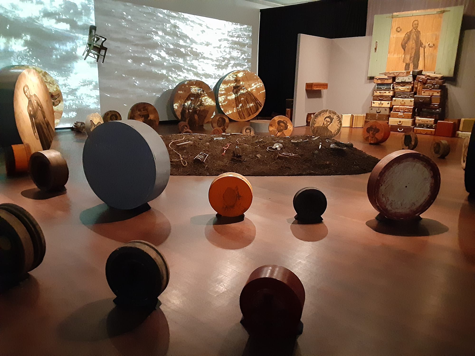 In the next room, the smell of nutrient-rich earth and decomposing tree bark, like the scent of sweet cloves, subtly envelops the viewer. The sounds of running water and chirping birds accompany the scents, suggesting change, or a sense of crossing over. Entitled “Deep River” (2013), the work envisions the conditions for runaway slaves during the Civil War, many of whom traversed the Tennessee River to find asylum in the Union Army's “Camp Contraband” in Chattanooga, Tennessee. At the middle of the installation is a large mound of earth, strewn with bottles, lamps, musical instruments, bibles, and guns, and encircled by turned wooden discs on which Lovell has painted portraits of Black people from the Civil War onwards. A pile of suitcases is stacked against the wall, above which is a portrait of a man surrounded by keys, a symbol of freedom. Video projections of undulating waves flittering in sunlight resonate with a palpitating sense of longing.