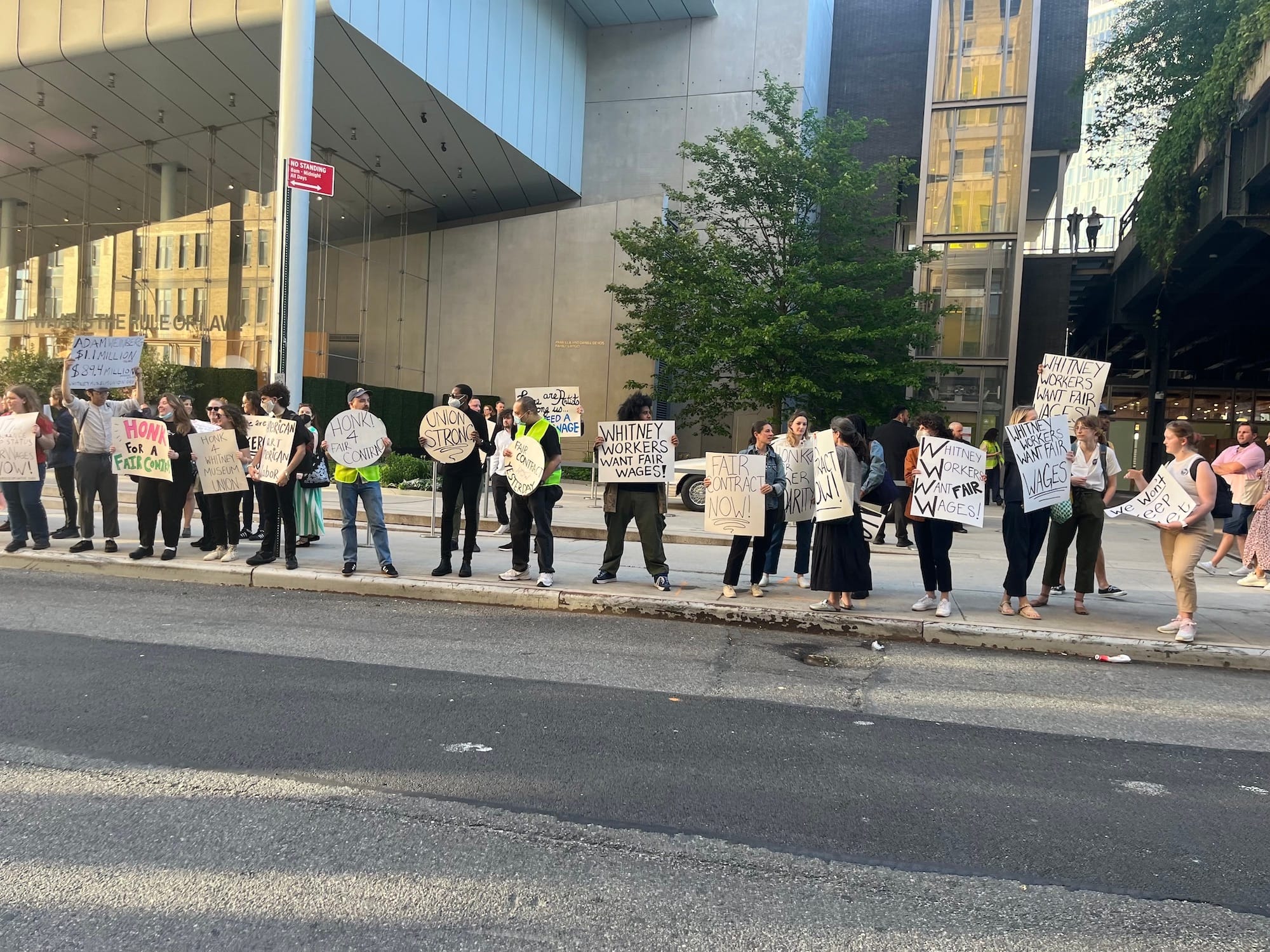 Attendees of a gala last evening, May 17 at the Whitney Museum of American Art — the New York institution's principal fundraising event of the year — could not steer to the entrance without bypassing a clamorous crowd of about 80 protesters, who broke the event’s veneer of civility and imbued the barren West Chelsea corridor with the aura of a sporting match. Workers at the museum rang bells, chanted, and cheered when taxi drivers and chauffeurs who just dropped off their employers honked in support of them, holding signs that read “Honk for a Fair Contract” and “Union Strong.”