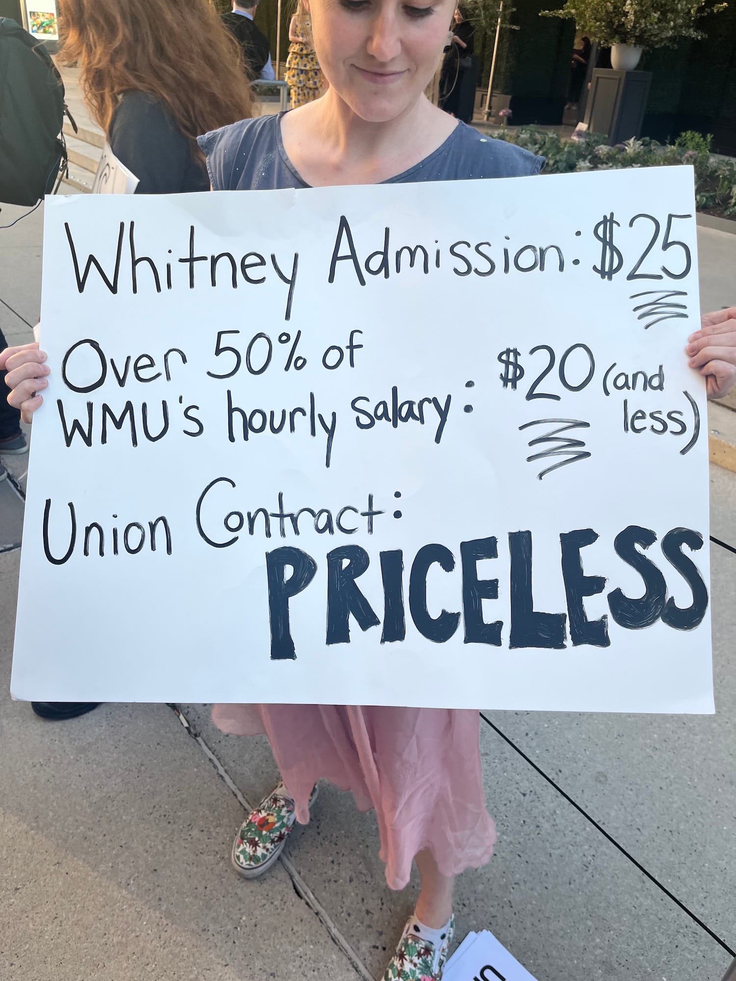 “They’re proposing lower wages than they’ve ever given even before people organized,” Rosenstein said in an interview with Hyperallergic. The offer, which was delivered on April 19 — “three months after we gave them a wage offer,” Rosenstein noted — put forward a 2.5% increase in wages, followed by a 2% annual increase for the next three years. “Inflation’s at 8.3%,” Rosenstein pointed out, adding that pay rates as they stand now are unacceptably low. A majority of workers at the Whitney make under $20 per hour.