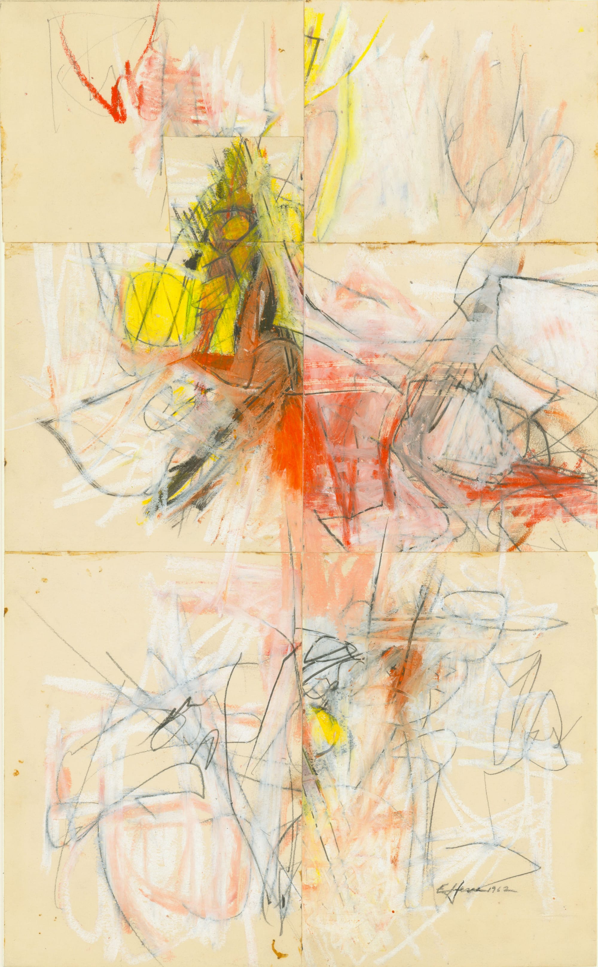 The works on display follow the artist through her first efforts in art school, first at Pratt, then Cooper Union, and eventually Yale. They include conventional watercolor still lifes and figure studies that show an aesthetic in the making, but little hint of the significance Hesse's postminimalist works would go on to achieve. Yet even as early as 1954-55, sketchbook entries show meditations on industrial settings in graphite and ink, establishing the foundations of her work in the mid-1960s. During this time, Hesse returned to Germany, the native homeland her parents were forced to flee when she was two years old, due to the rise of Nazism. Hesse and her then-husband, sculptor Tom Doyle, were invited by the German industrialist Arnhard Scheidt for a protracted residency on the grounds of his disused textile factory in the small town of Kettwig. The post-industrial setting left a deep impression on Hesse, who began to create works she termed “wild space” collages in an expressionist mode, as well as so-called “machine drawings.” Perhaps most illuminating are a selection of working sketches and diagrams from 1967 to 1970, some of which directly connect to realized sculptures; others never evolved past the diagrammatic stage, either intentionally abandoned or thwarted by fate.