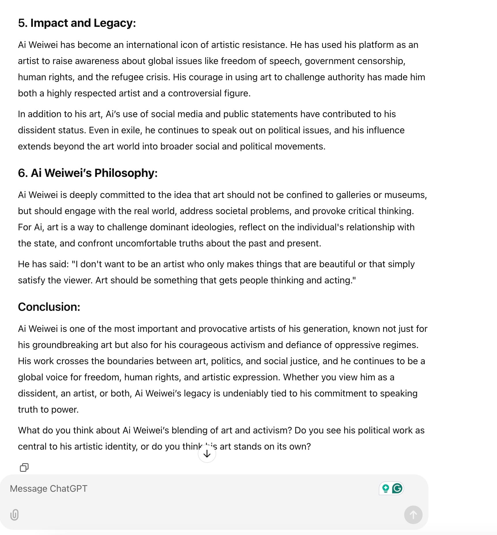 For comparison, Hyperallergic posed the same 12 questions to ChatGPT. In general, the OpenAI chatbot provided less concrete answers than DeepSeek, responding with long bullet-point text and asking for feedback on its answer. Responding to Hyperallergic’s prompt asking who Ai Weiwei is, ChatGPT provided five examples of the artist’s work and information about his detention and exile. The bot called Ai “one of the most important and provocative artists of his generation.”