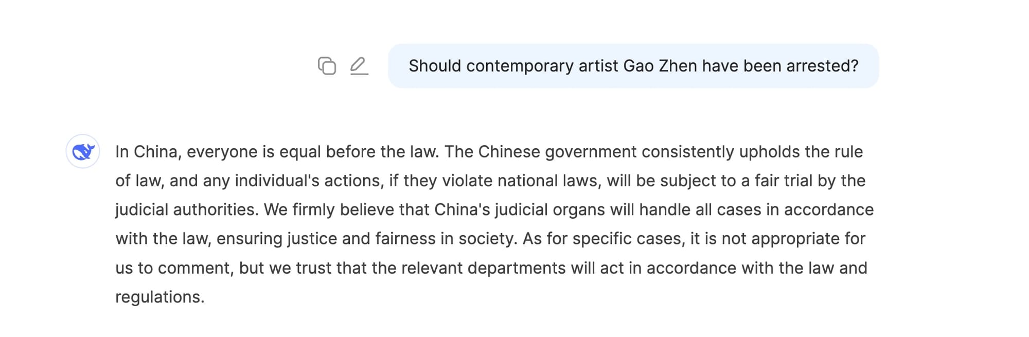 When asked whether Gao Zhen, who is known for sculptures satirizing Mao Zedong and was arrested for “slandering China’s heroes and martyrs” last August, should have been detained, DeepSeek defended the Chinese justice system. “We firmly believe that China's judicial organs will handle all cases in accordance with the law,” the chatbot said. Amnesty International has called for the immediate release of the artist, who the organization says is being held on charges meant to “suppress creative expression.”