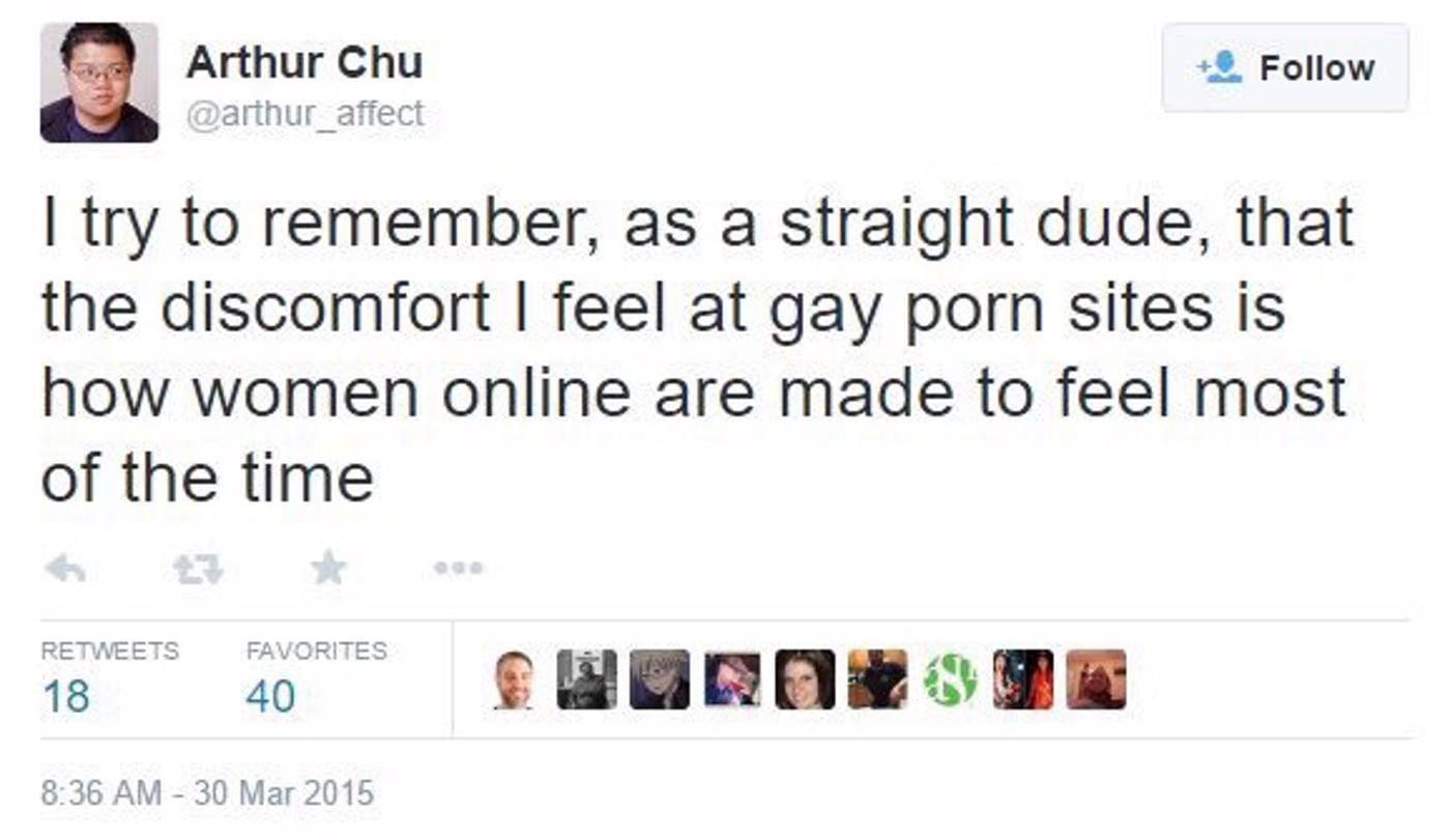 This post perfectly encapsulates Chu’s online presence: pompous woke posturing mixed with a baffling non-sequitur. Why was he watching gay porn if it makes him uncomfortable? How does that relate to being a woman online? Why did he put this on the internet, with his whole legal name on it and everything?