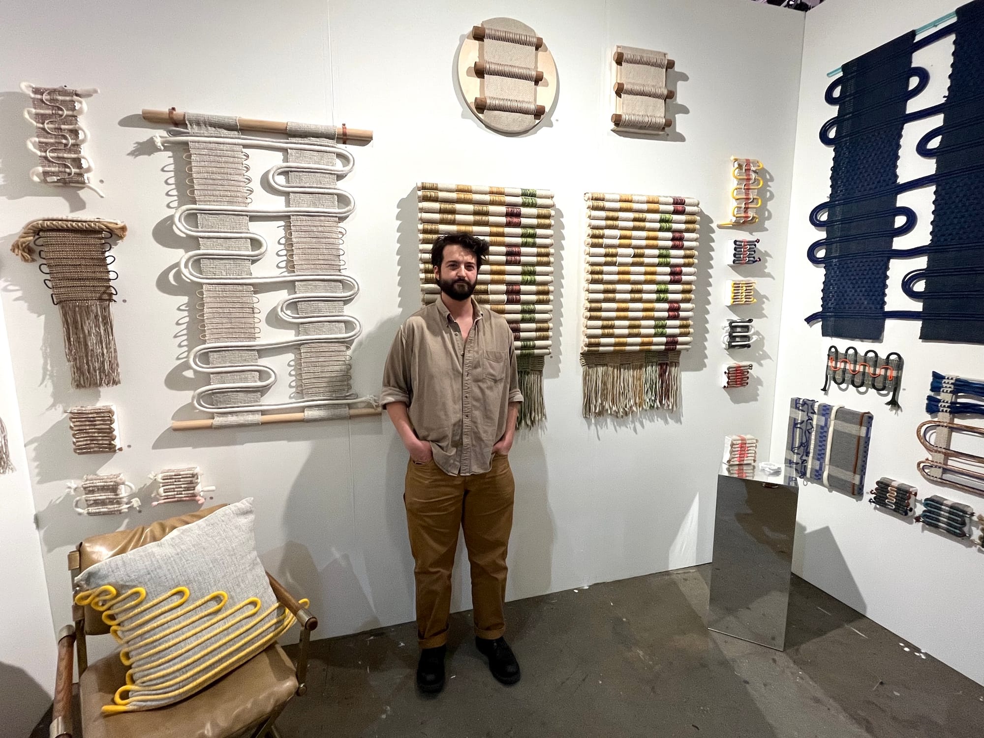 Textile artist William Storms examined his hanging weavings while greeting two of his friends who came out to support him. Storms typically works with interior designers for tech firms, where he has created giant fabric pieces that stretch across multiple floors of an office building, but his works at the fair are much smaller, some incorporating e-waste like corded headphones and charging wires.