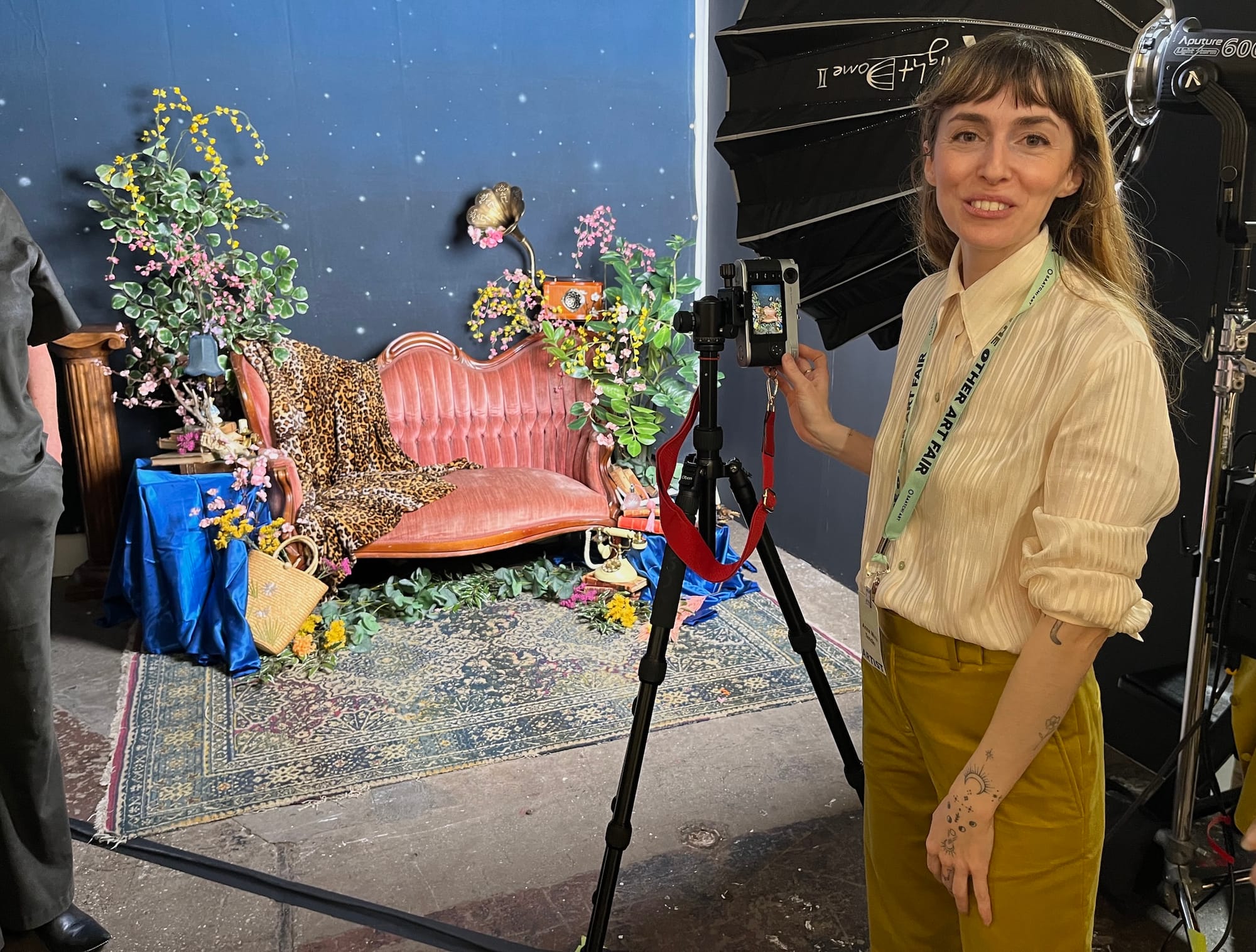 At the opening last night, May 8, pop music blared through speakers as a crowd clustered outside an antique subway car currently occupied by the fair’s co-sponsor, the Texas-based distillery Balcones, which gave samples of its whiskey. Nearby, multimedia artist and writer Ann Marie Tendler adjusted her Leica M10 as she prepared to take styled portraits of art fair guests in a photo booth outfitted with an ornate Victorian couch, bouquets of flowers, and a leopard skin draped on its side. The space was inspired by her photography series Rooms in the First House (2022) and her memoir “Men Have Called Her Crazy” (2024).