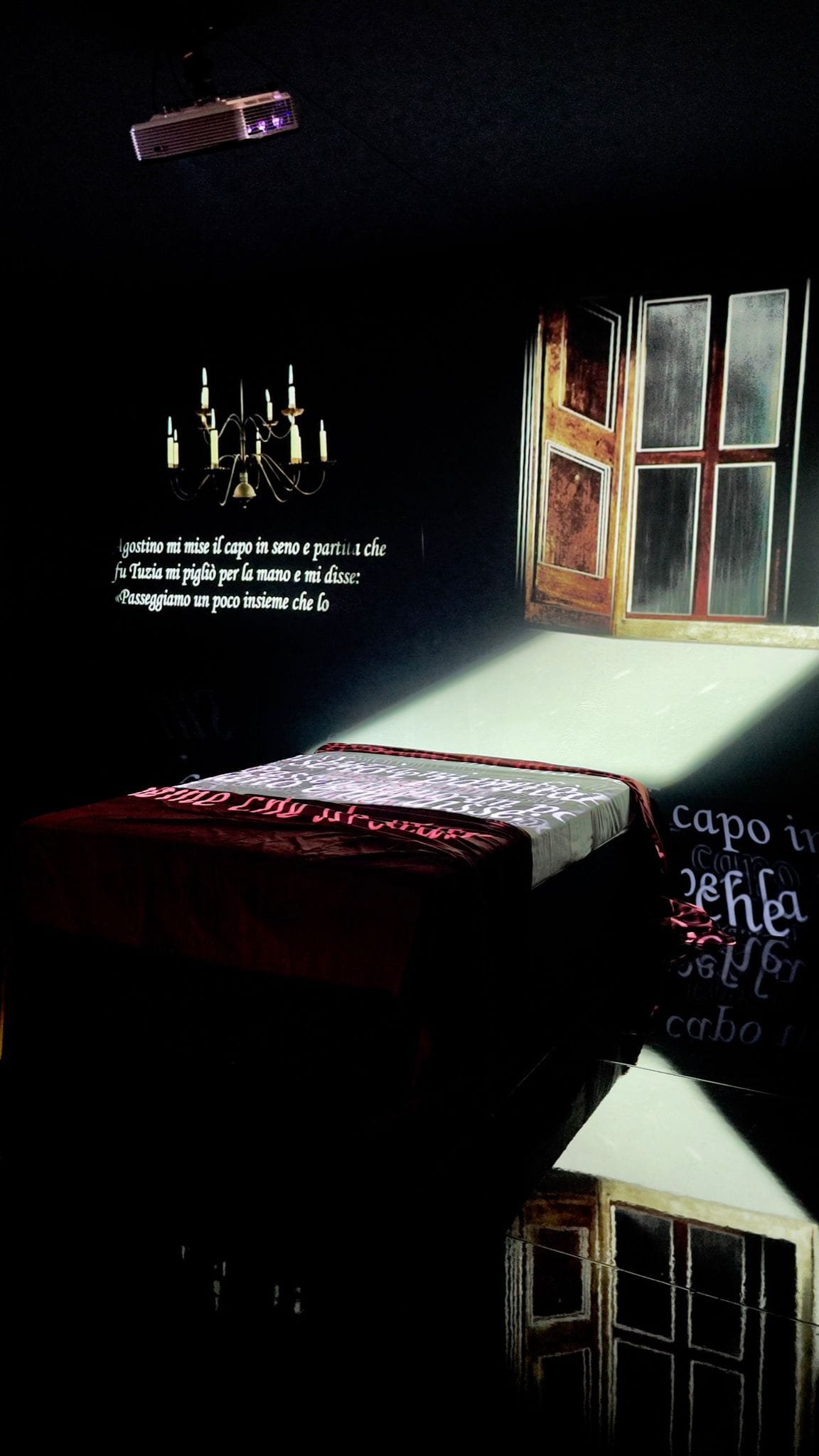 The most horrific part of the exhibition is what its critics have dubbed the “rape room”: a dark room with a bloodied bed at the center, surrounded by projections of Gentileschi’s paintings, also dripping in blood. Echoing in the space is the voice of an actress reciting Gentileschi’s contestations at trial, recreating the artist’s rape in every detail.