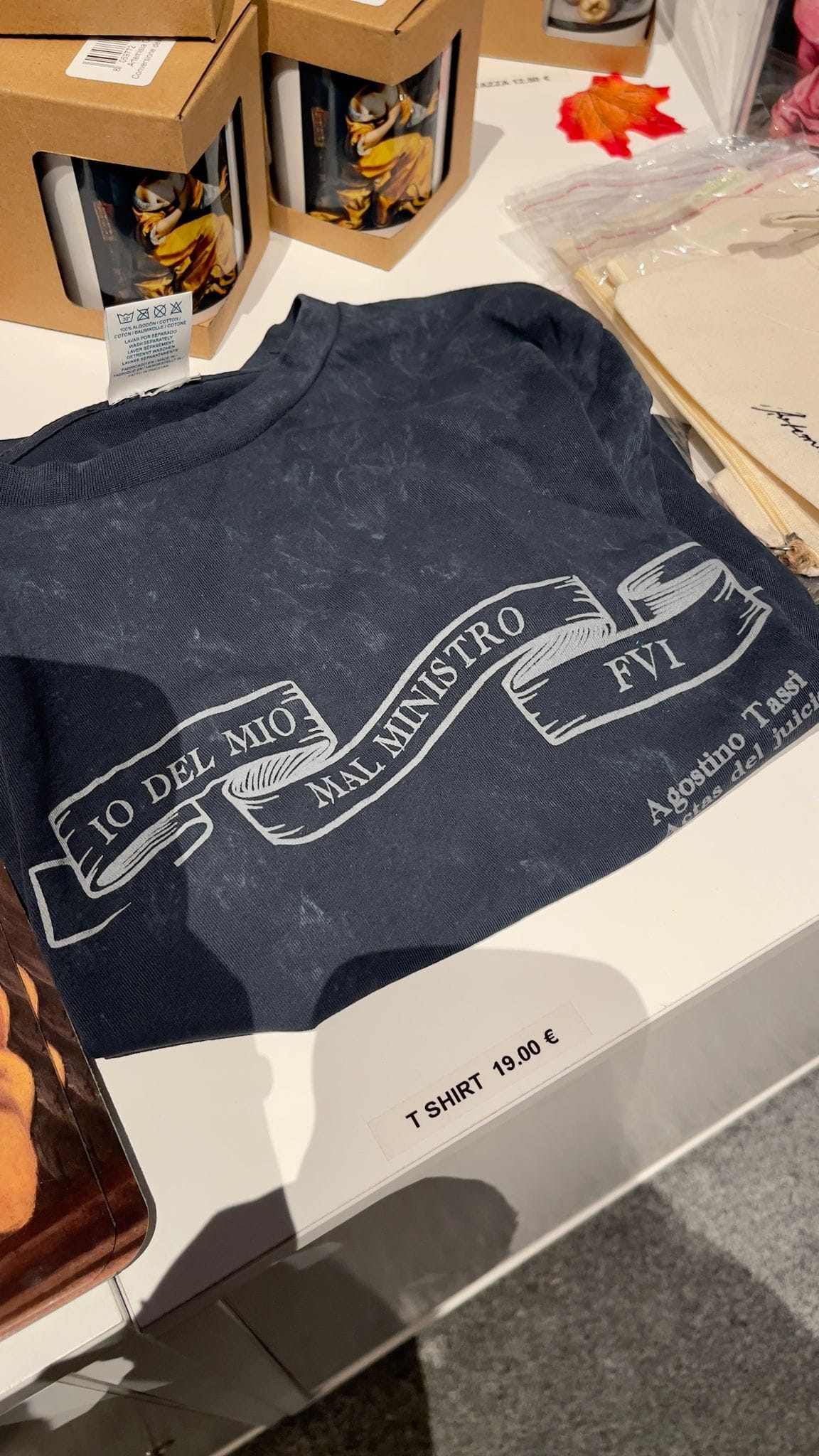 The cherry on top of this haunted house-like experience is the gift shop, featuring merchandise like T-shirts and keychains emblazoned with Tassi’s self-absolving quote “I was the minister of my evil” (“Io del mio mal ministro fui”). The obscene book At Night You Drive Me Crazy: Erotic Acts of Agostino Tassi, Painter by Pietrangelo Buttafuoco, the Italian rightwing journalist who was chosen to helm the 2024 Venice Biennale, is also proudly on sale.