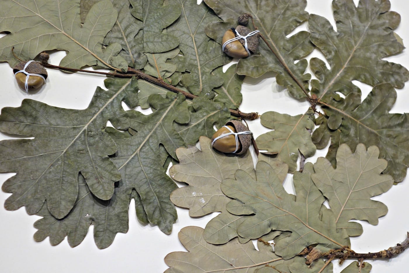 English oak specimen, with its acorns tied to the sheet, on view in What in the World is a Herbarium? (photo by the author for Hyperallergic)