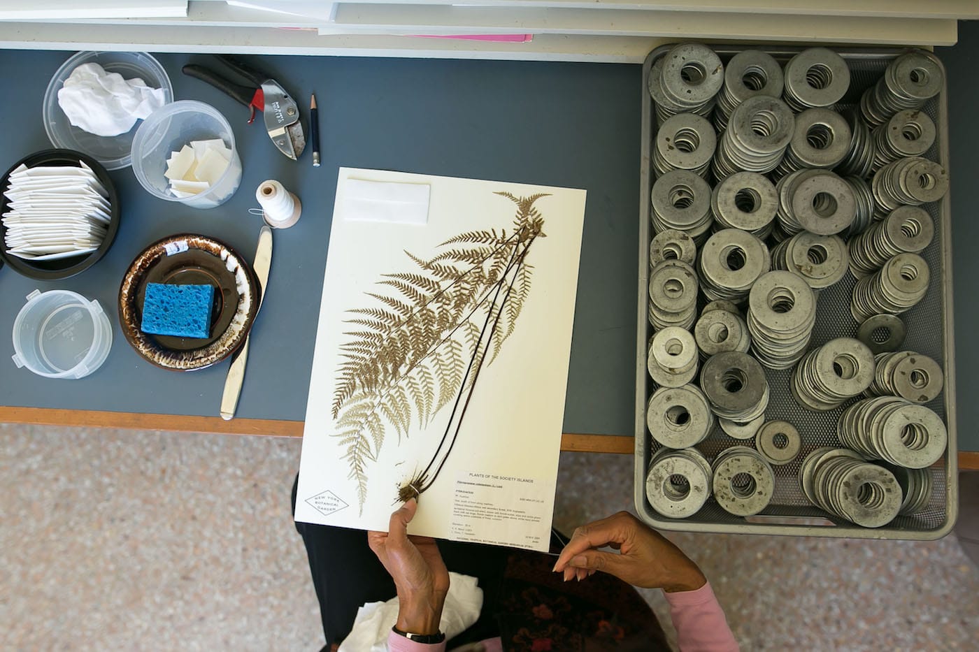 Some specimens are complicated. Palm leaves must be spread across multiple pages, and cumbersome objects like Brazil nuts and fruit have to be lodged separately or suspended in spirits. (One of the three mounters working during my visit described a recent arrival that had nuts shaped like pangolins.) Yet it’s mostly a delicate process of placing the plant in a permanent pose that will suggest its living presence, held in place on the sheet by glue or thread. “It’s something that combines scientific knowledge and artistry,” Pace said. Duplicates are shared with other herbaria, in case of the tragic loss of an entire collection, such as when Berlin’s Botanic Garden was firebombed in 1943.