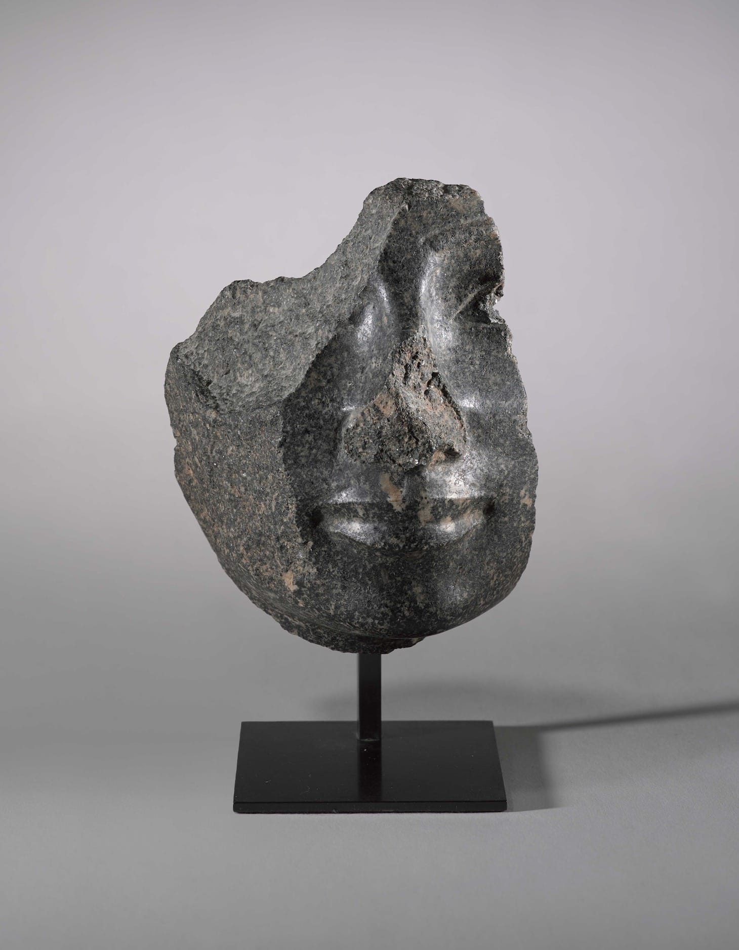 This sculpted head also demonstrates a particular kind of material vulnerability. It was part of a composite statue made of a number of other stone pieces, both for the body and the crown. Composite statues like this one were especially prone to damage because they were held together with dowels and could be easily disassembled.