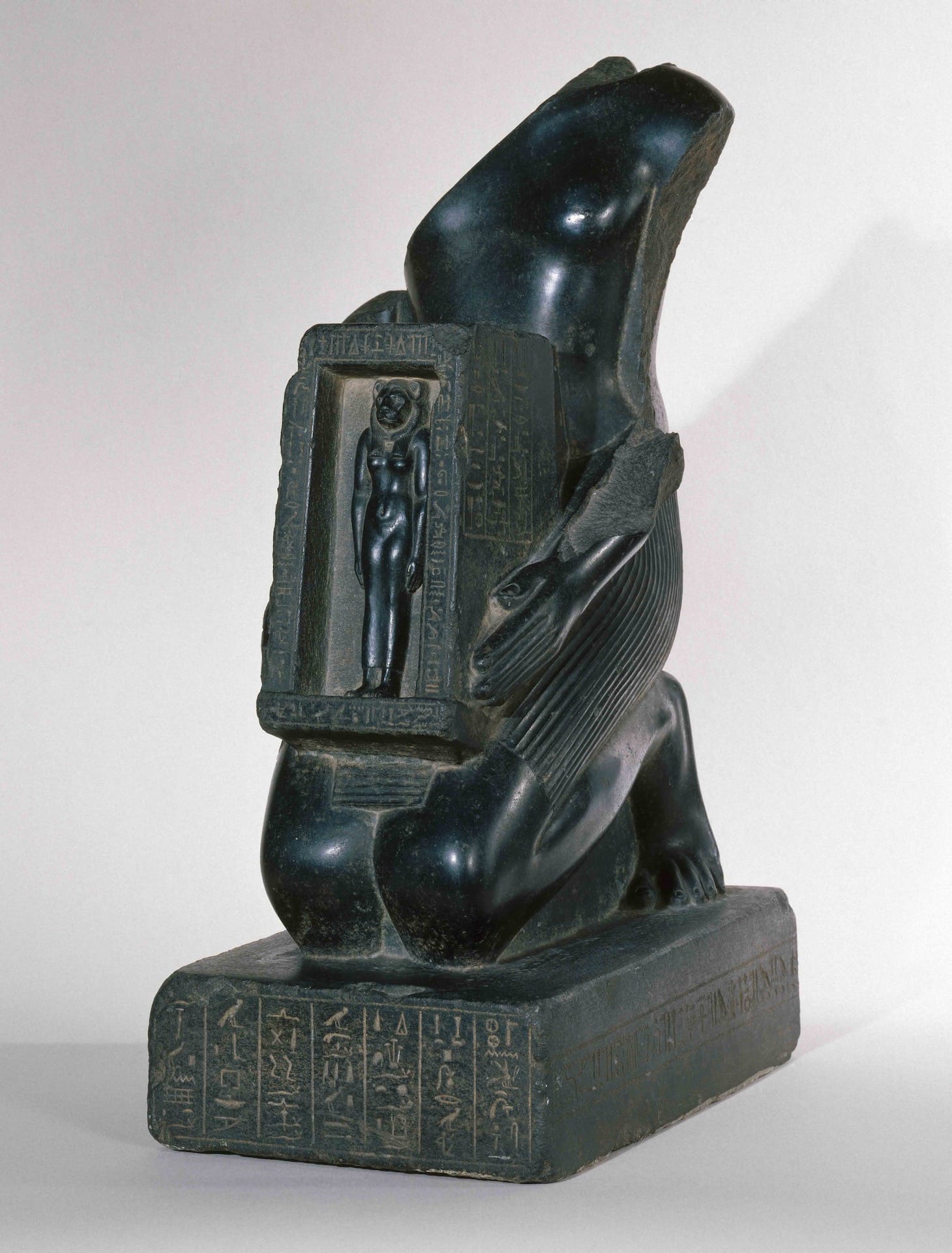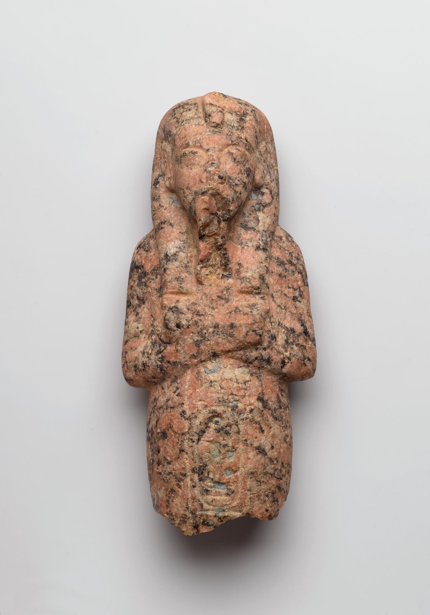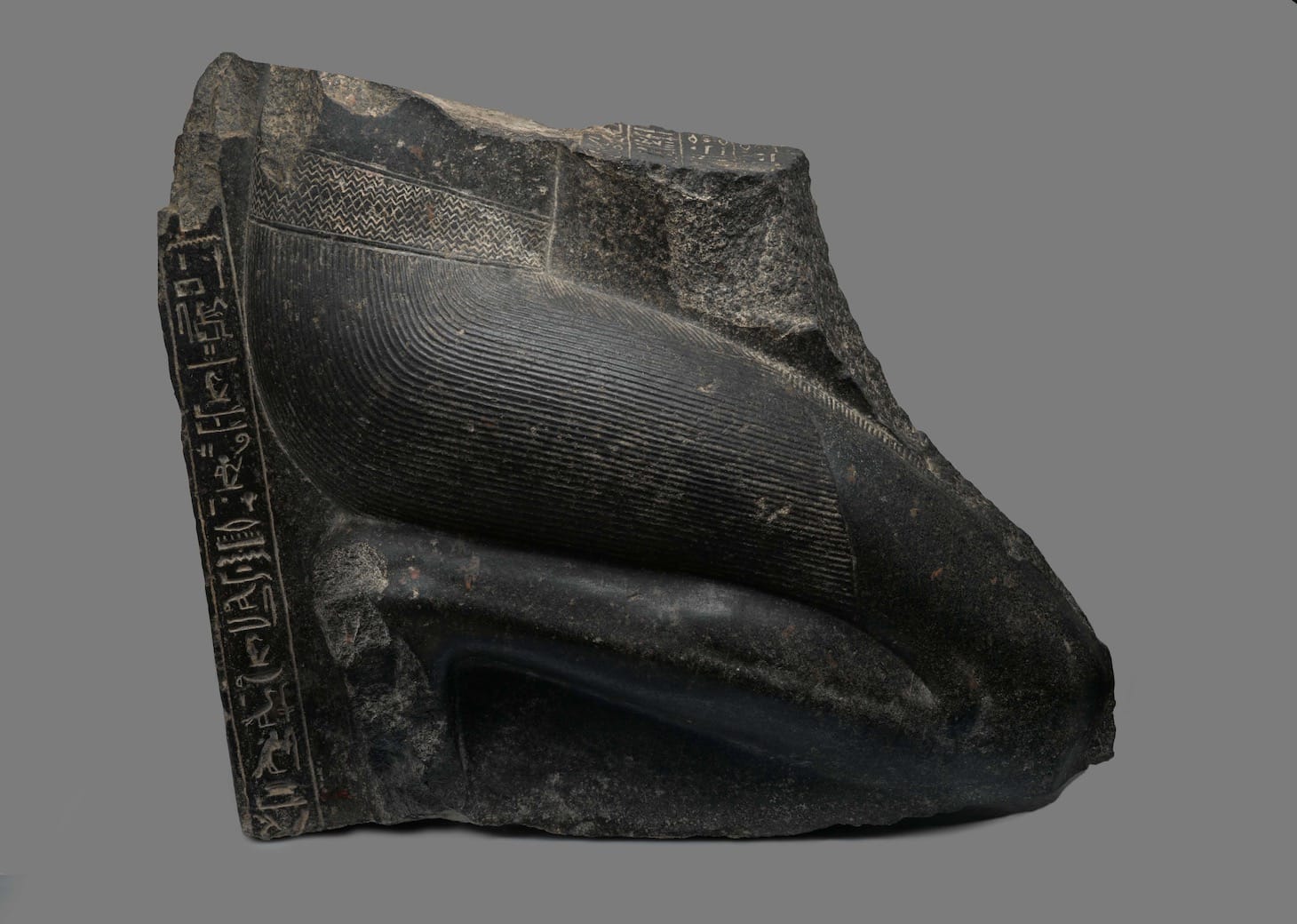 Minmose sits on an oblong base and against an inscribed back pillar. He holds an image of the goddess Hathor. The divine image likely supported a sistrum, a musical instrument that is a common offering to this goddess. Inscriptions on the back pillar, around the entire body, and on the shoulders are all intact, preserving his name in several places. Yet, Minmose’s head, arms, and one knee are missing.