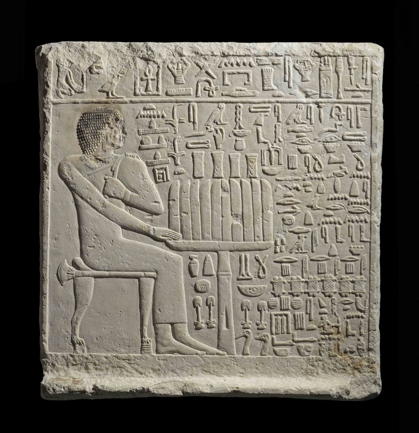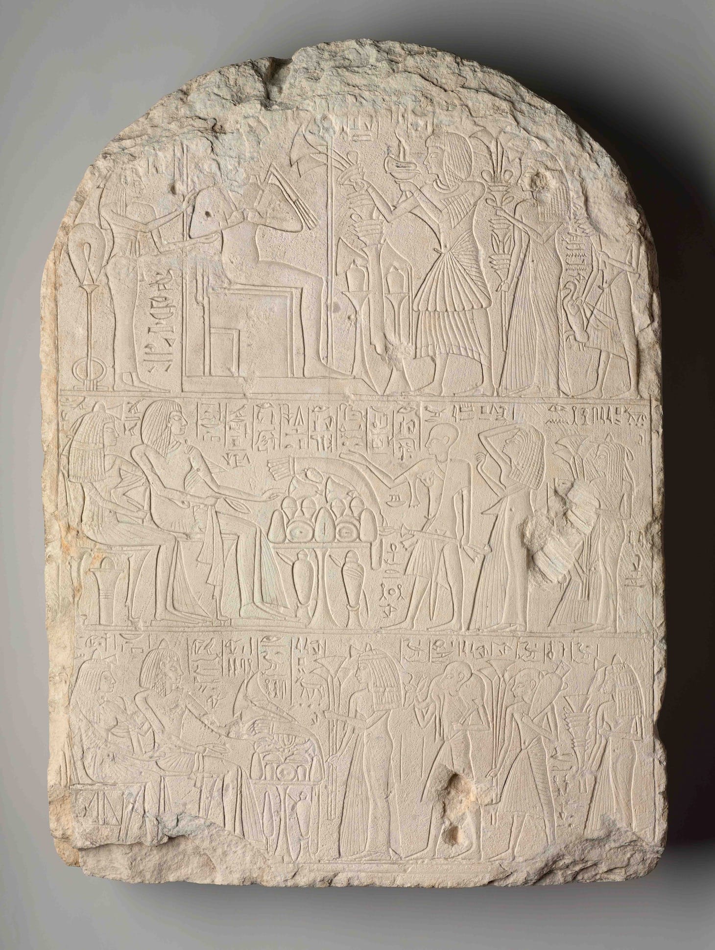 During Akhenaten’s reign, his men removed the name of Amun from many monuments. A fragment of a stela for a man named Amunemhet may have been damaged because of the name of the owner, which means “Amun is the foremost.” It had been made about 70 to 130 years before Akhenaten banned the worship of Amun. The stela bears a representation of an offering table laid with offerings, male and female figures who make the offerings—and above them, five columns where a hieroglyphic text has been purposely removed. Enough hieroglyphic traces remain to suggest that it contained the names and titles of officials of the temple of Amun.