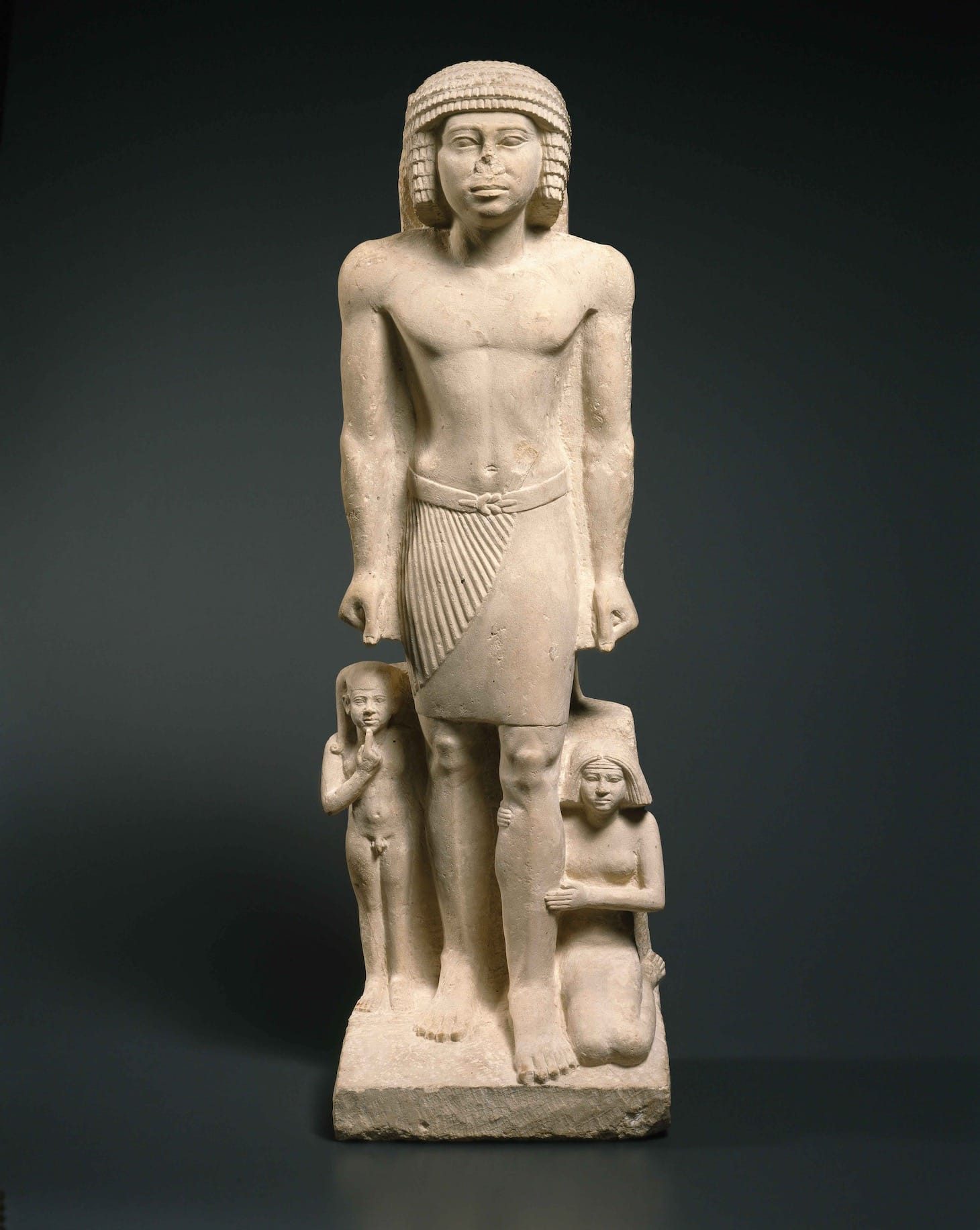 There is a second statue of Irukaptah in the exhibition. Its identifying inscription was never added, but early 19th-century documentation suggests that it, too, came from the tomb of Irukaptah. This time he stands, in the traditional pose, with left foot forward and hands at his sides. In this second statue he is again accompanied by subsidiary figures. Here he is presented as the head of a household, with his wife and his son, who are shown at a reduced scale, which is typical of such family portraits. The statue would have represented the entire family buried in the tomb.