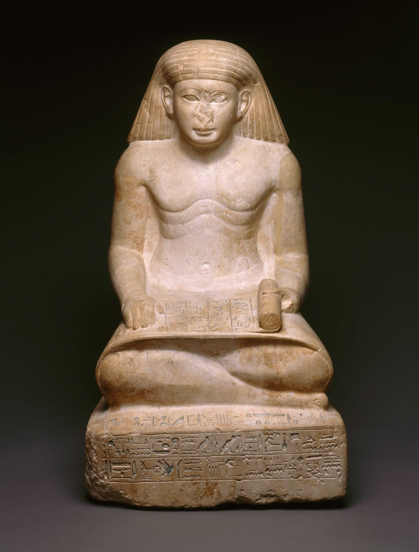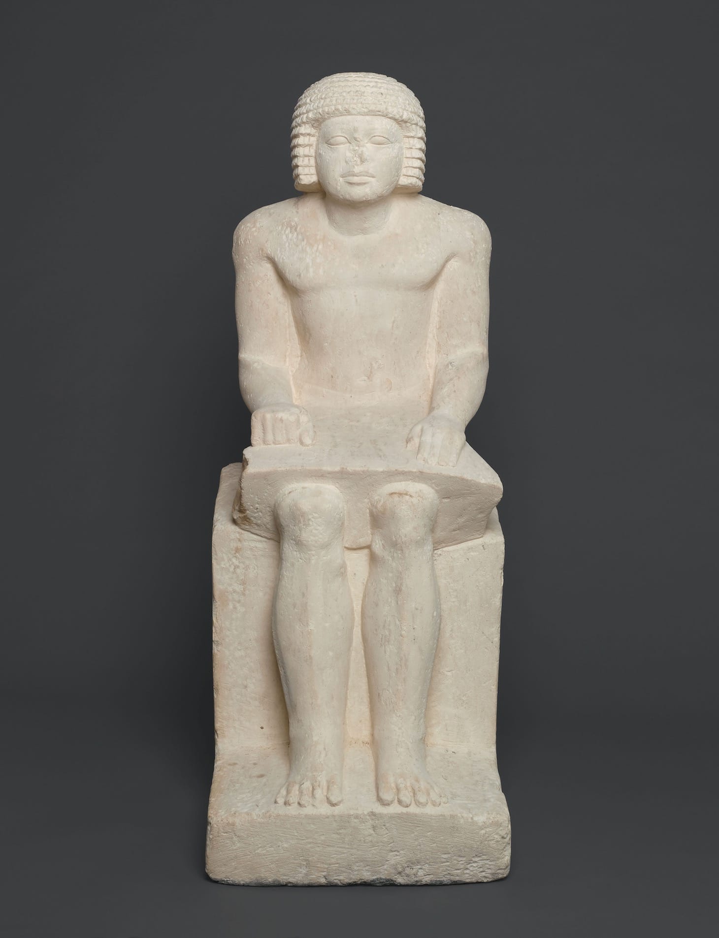 Much can be learned by comparing how two similar statues have been differently damaged. Amunhotep (Son of Nebiry) and Djehuti are represented as literate noblemen; each holds a papyrus scroll in his lap as he sits on the ground. On each statue, incised lines on the abdomen represent rolls of fat that are emblematic of well-fed wealth. Both statues were made in the earlier part of the Eighteenth Dynasty and were probably quite similar when they first were complete.