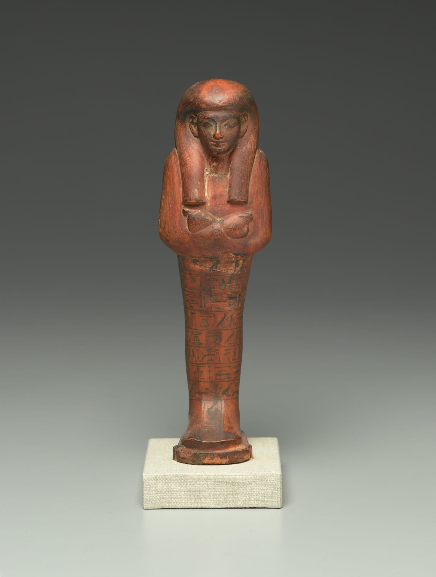 The green siltstone or greywacke Overseer of Weavers, Min is a typical temple statue type and is largely intact. Donors placed block statues in temple courtyards to allow a part of the soul called the ba to have a resting place during rituals. Individuals could then continue to participate in worshipping the god even after death. This mostly complete block statue helps a viewer envision what is missing from Minmose.