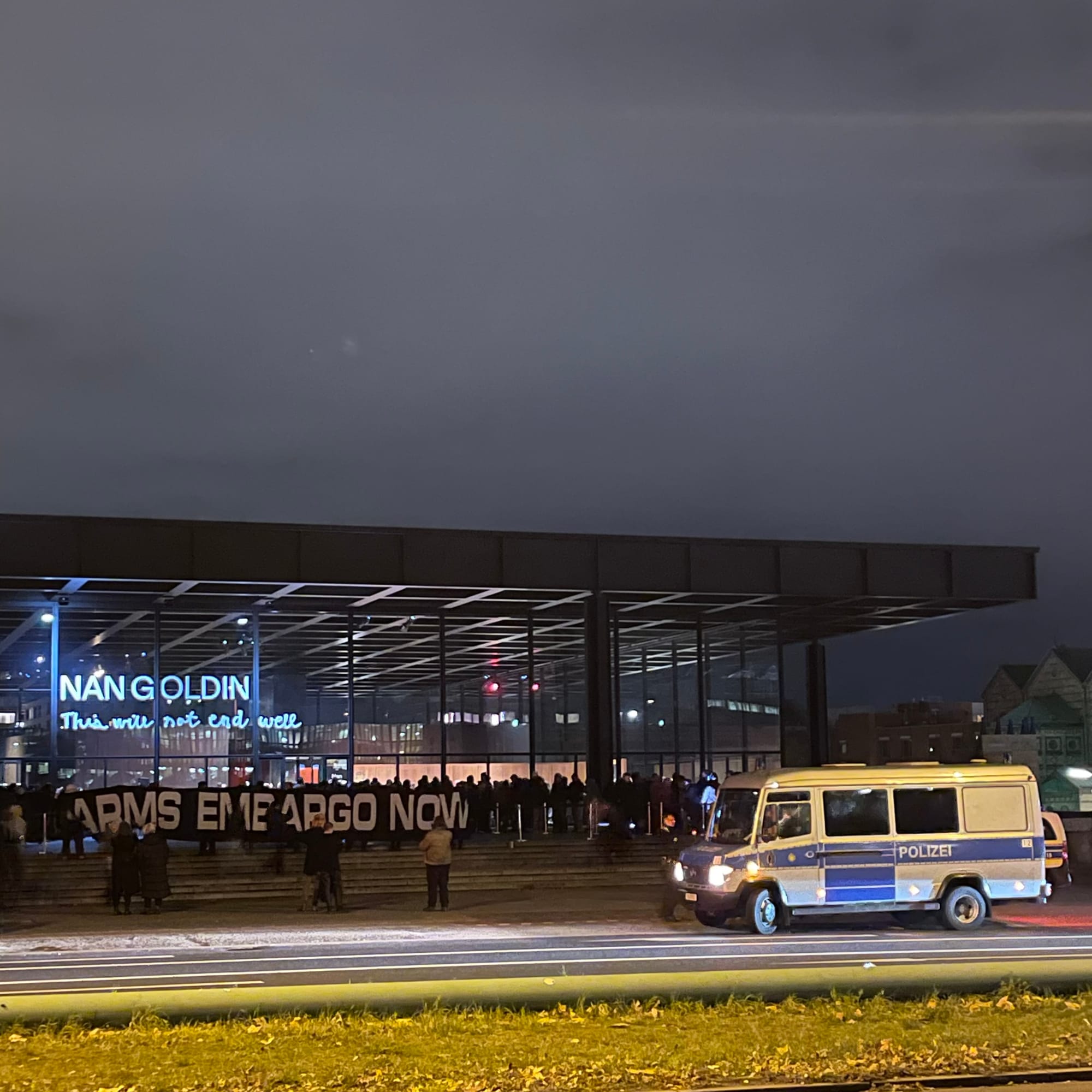 Conflicts simmering at the Neue Nationalgalerie in the previous weeks reached a boiling point during Goldin's opening reception. The museum had planned a symposium titled "Art and Activism in Times of Polarization: A Discussion Space on the Middle East Conflict" for November 24 — two days after the opening of the retrospective. The boycott advocacy group Strike Germany called attention to the event, curated by Pakistani-German political analyst Saba-Nur Cheema and Israeli-German writer Meron Mendel, in an Instagram post claiming that the symposium would be "dominated by genocide-denying Zionists while pretending to offer multiple 'nuanced' positions." Reached by Hyperallergic, Cheema and Mendel said that the symposium was meant to "create a controversial yet respectful space to discuss the role of the Israel-Palestine-conflict in the art world."