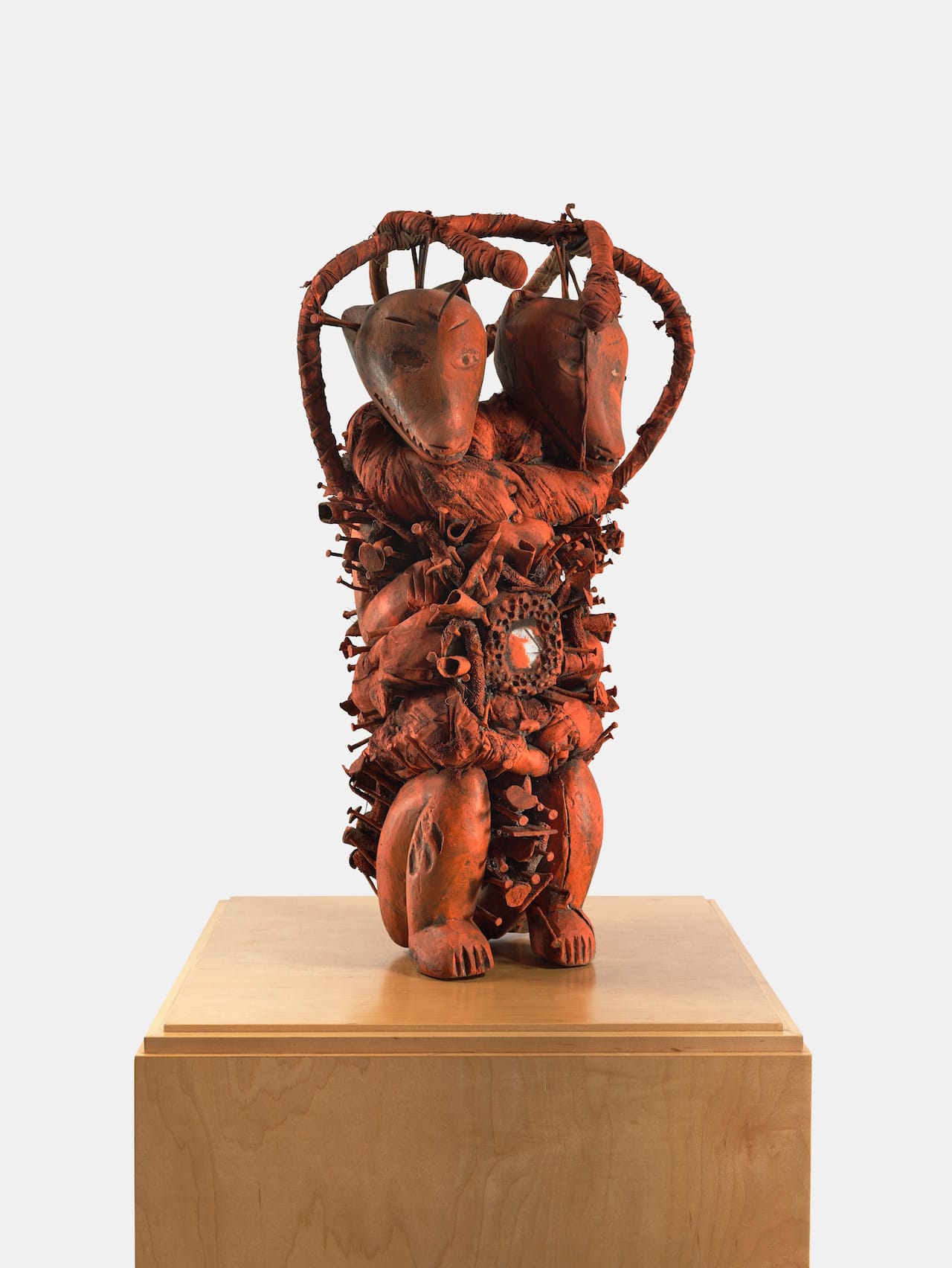 Other artists join disparate objects, of course, but none as well as Hammons, even when he is not at his best. On the gallery’s second floor, a wooden drum stands by the window. An orange, taxidermied cat, nearly the same color as the drum, lies curled up on top of it, literally and figuratively muffling it. The piece is both perverse and domestic, a combination that reverberates with varying degrees of success throughout the exhibition.