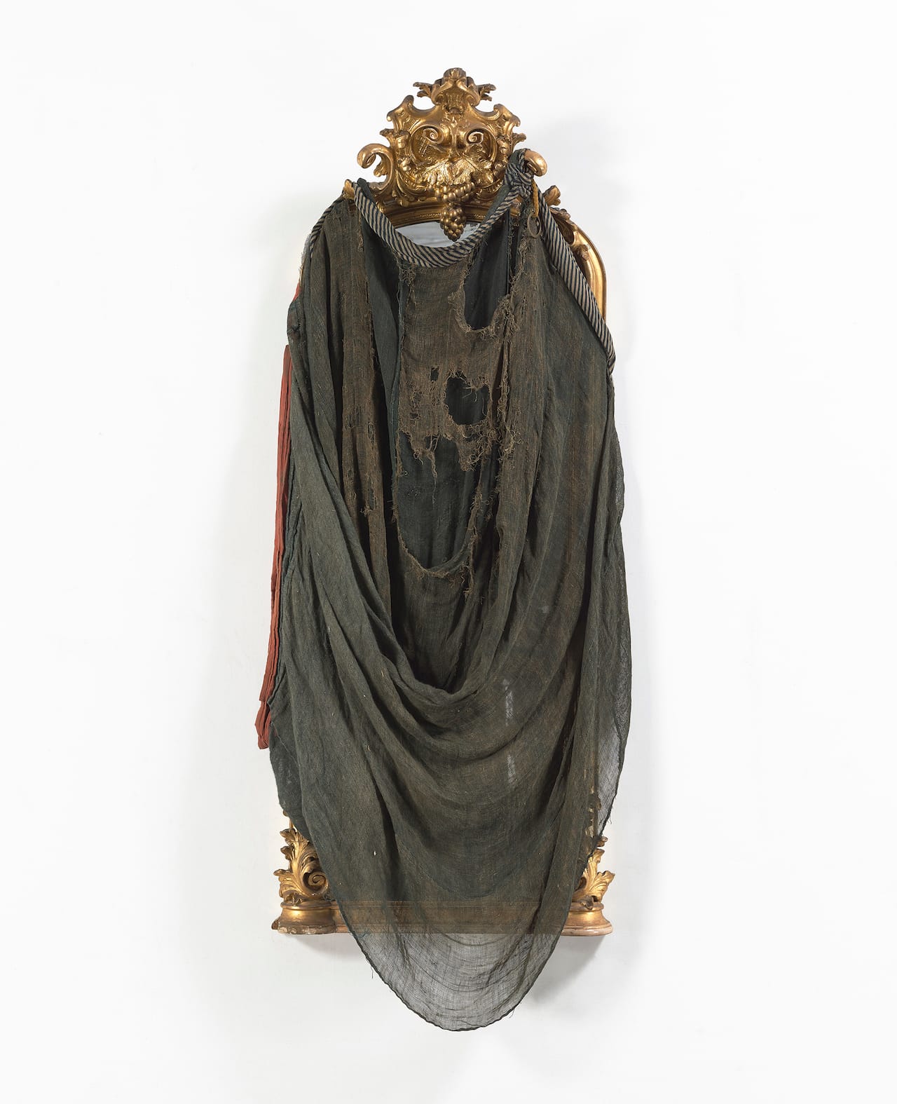 Jasper Johns famously wrote in a sketchbook note: ”Take an object. Do something to it. Do something else to it.” Hammons seems to have streamlined that observation — taking something and doing just one thing to it, which turns out to be an incredibly efficient joining together of two disparate objects, usually from very different economic classes. When Hammons attaches a dirty tarp to a wood-and-plaster framed mirror, he is covering and defacing an upper class sign of vanity. We want to see ourselves, not others and how they live. Does covering the mirror, leaving only part of the gold frame peeking through, suggest that we have looked away or that we cannot see?