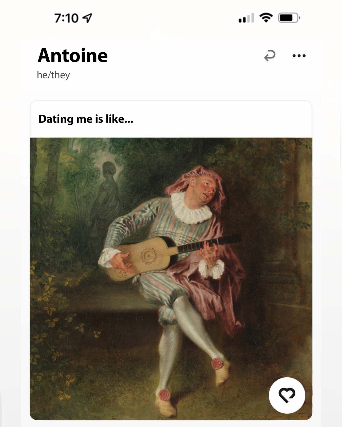 It's sweet if you're into it, but it's all fun and games until he breaks this out unprompted at your friend's housewarming party. Then everyone either can't stop staring or ends up forcibly ignoring him like that statue in the back ... It's a roll of the dice with this type, really.