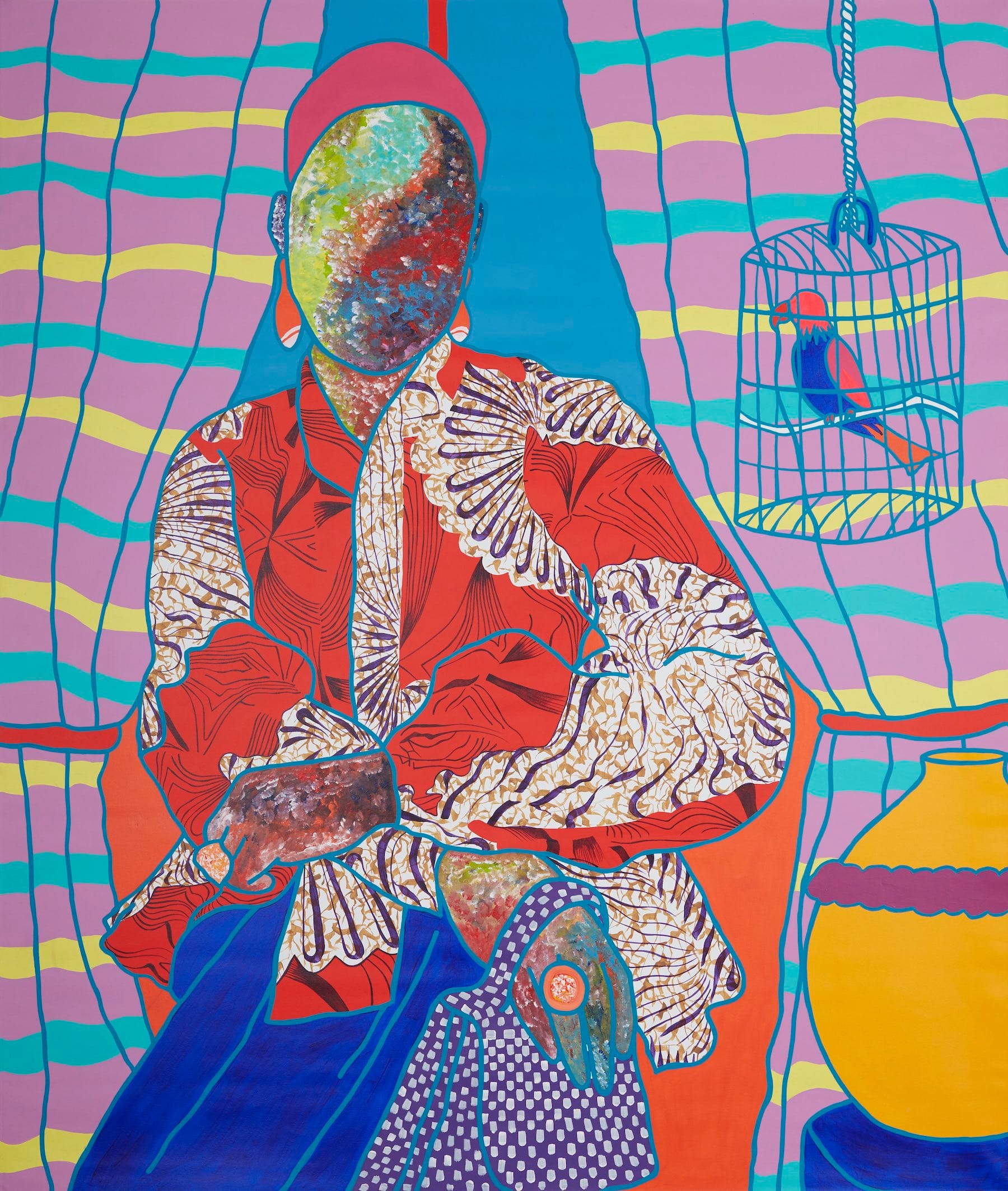 The exhibition is both thematic and (broadly) chronological. The first gallery, Origins and Adaptations, is a whistle-stop tour highlighting various examples of the trope, from an ivory panel created in 900–700 BCE in Nimrud (modern-day Iraq) to a portrait of an “influencer” by Cameroonian artist Ajarb Bernard Ategwa, painted last year. The room also includes Rembrandt’s iconic “Girl at a Window” (1645) from Dulwich Picture Gallery’s own collection, a work that is both enigmatic and unsettling. The unknown sitter, whom the artist painted from life, has been described over the centuries as his bride, lover, or “courtesan.” Yet, although she has a woman’s body, her big-eyed, rosy-cheeked face is clearly that of a child.