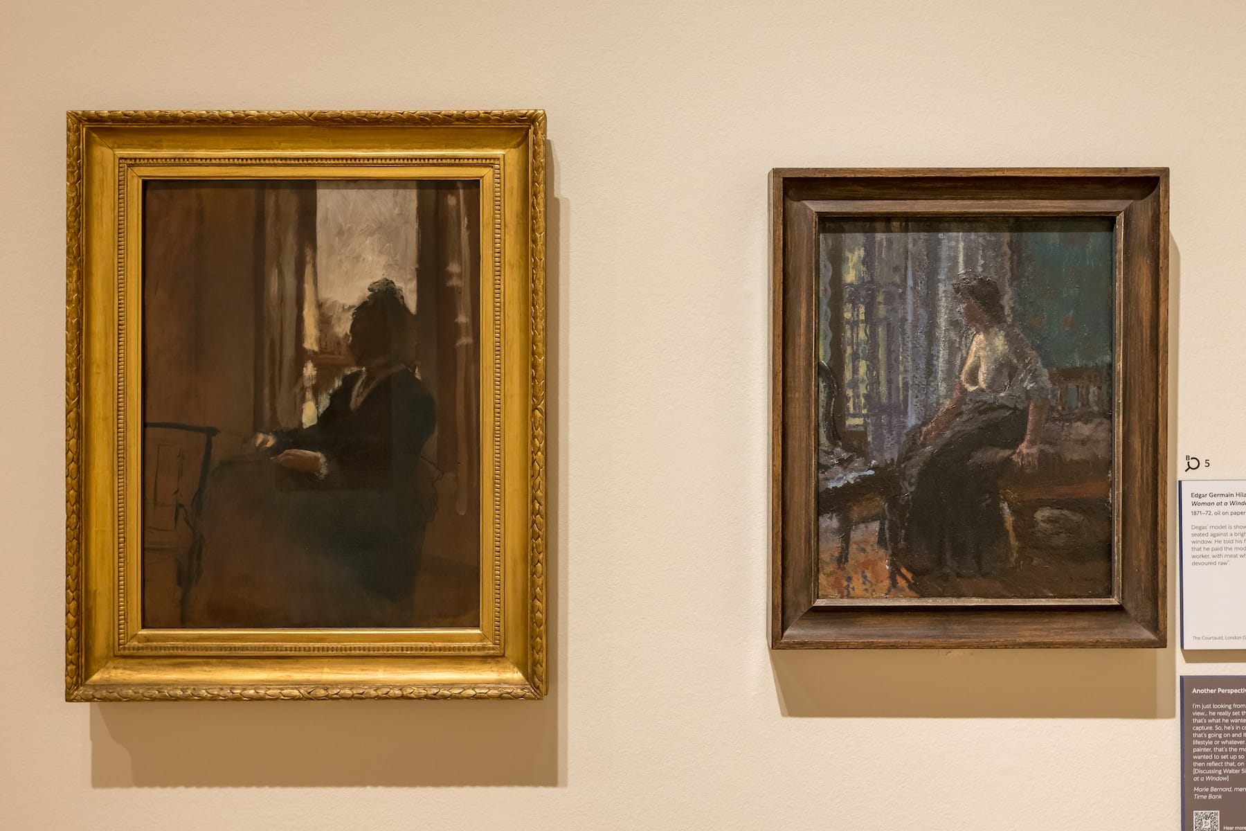 But just as interesting as the connections between works are the divergences. Opposite the Madonnas, under the theme Models and Muses, are two very different portrayals of women in windows, by Edgar Degas and Walter Sickert. In Degas’s composition, conjured from a palette of browns and grays, the woman sits with her back turned to an overcast Parisian sky, hands placed solemnly on her knees. The tranquility of the painting is undermined by the story behind its creation. The model, a starving sex worker, was paid with a hunk of meat, which she allegedly “fell upon, so hungry was she, and devoured raw.” Degas relayed this incident to his friend Sickert, who bought the painting and created his own, characteristically seedy, version of it. His bare-breasted sitter (most likely also a sex worker) stares out of the window, while perched on a bed.